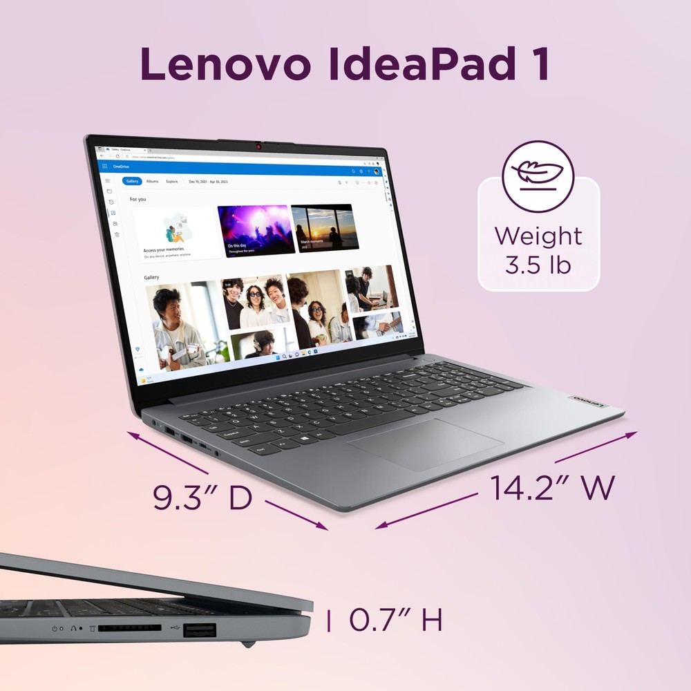 Lenovo IdeaPad 1 Laptop 15.6” Ryzen 5 5500U 8GB 512GB Win 11 Home Cloud Grey Features MULTITASKING MASTER - The IdeaPad 1 is a thin and compact laptop that offers responsive performance and anticipates your every need for effortless on-the-go multitasking MORE EXPANSIVE DISPLAY - Indulge in a better binging experience by immersing yourself in your favorite shows with a borderless display for more screen while listening to clear, rich audio from two Dolby Audio speakers PERFORMANCE ON THE GO - Zip along while multitasking across several tabs, the new AMD Ryzen 5 5500U processor built on UMA architecture delivers punchy mobile performance with a 20W thermal design point LIGHTEST PART OF YOUR DAY - Weighing just 3.5 lbs, the effortlessly cool cloud grey laptop is lighter than your water bottle and just as essential SOLID SECURITY - Keep your home life private and be seen only when you want to be with the 720p camera that comes with a physical privacy shutter PRODUCTIVITY WITH NO LIMITS - No Wi-Fi? No worries, with 512GB storage, 12 hours of battery life, and rapid charge you can access and edit your files offline, anywhere and still have space for all your family's needs A SMARTER WAY TO LEARN - Flip to Start turns on your IdeaPad 1 immediately upon opening the lid, so you can hop on that urgent video call and let your ideas be heard thanks to Smart Noise Cancelling minimizing background noise EQUIPPED FOR WORK AND PLAY - Ready to connect to your world with 2 USB ports, USB-C port, HDMI port, SD card reader, and a combination headphone/mic jack SIZE UNPACKED (D x H x W) - 360 x 236 x 17.9 mm or 14.17 x 9.29 x 0.70 inches INCLUDED ITEMS - Computer, Charger, User Guide Details Fast and Free Shipping You're already purchasing the item. Why pay additional for shipping, especially slow shipping? We get your order shipped out within 1-business day and delivered to your doorstep as quickly as possible. Competitive Pricing With our dynamic pricing model, our prices are always competitive. Our prices are some of the lowest that you will find on the internet. Rest assured that you're getting a good deal when purchasing with us. 30-day Money Back Guarantee We are committed to making sure that you leave this transaction satisfied. If you're unhappy with the product for any reason, you may return it back for your money-back or a replacement within 30 days. No questions asked!