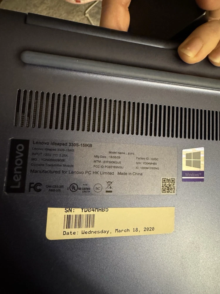 lenovo ideapad 330s-15ikb. Used for college and work related tasks. All is functional, don’t think the battery holds much of a charge anymore but works fine plugged in. Will factory reset and wipe drives as soon as purchased.