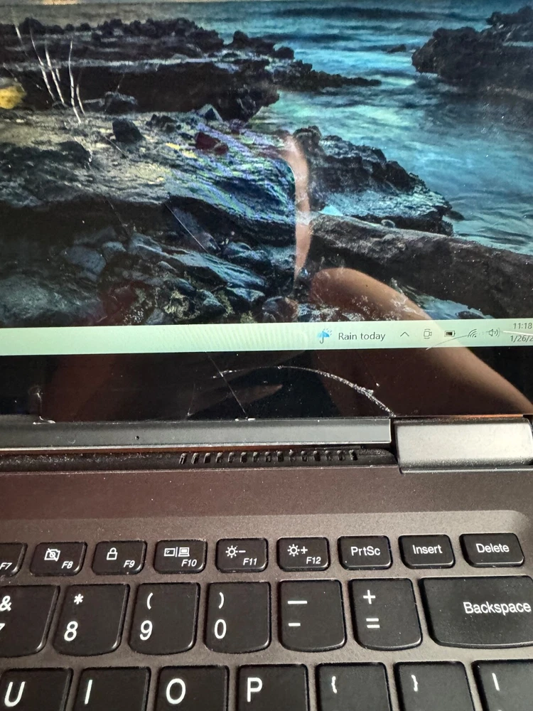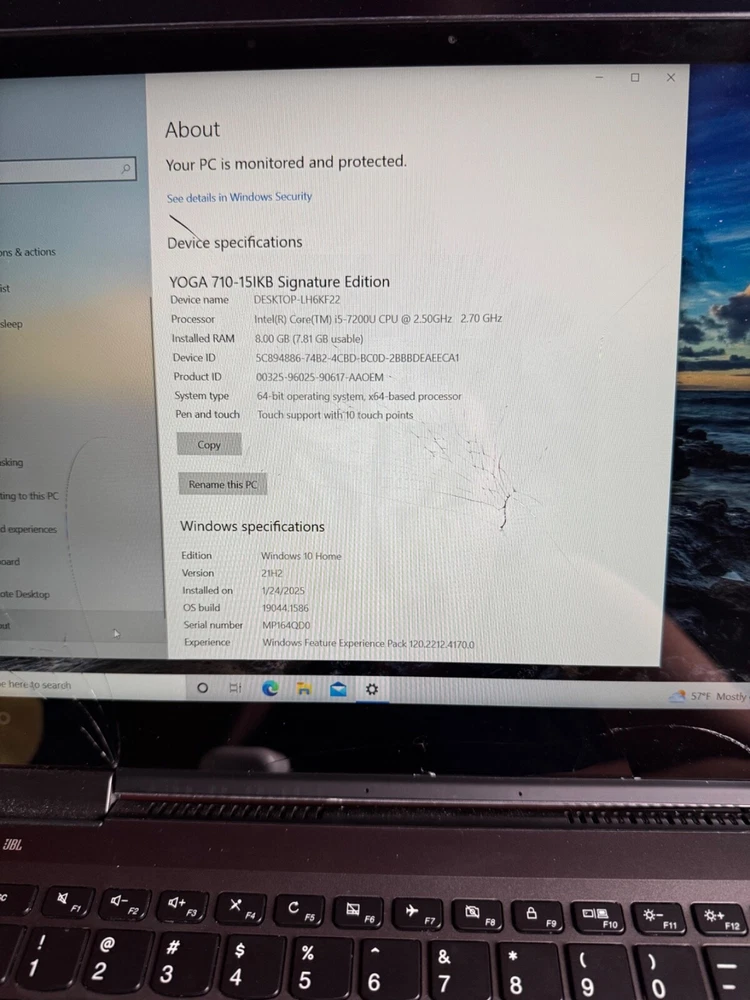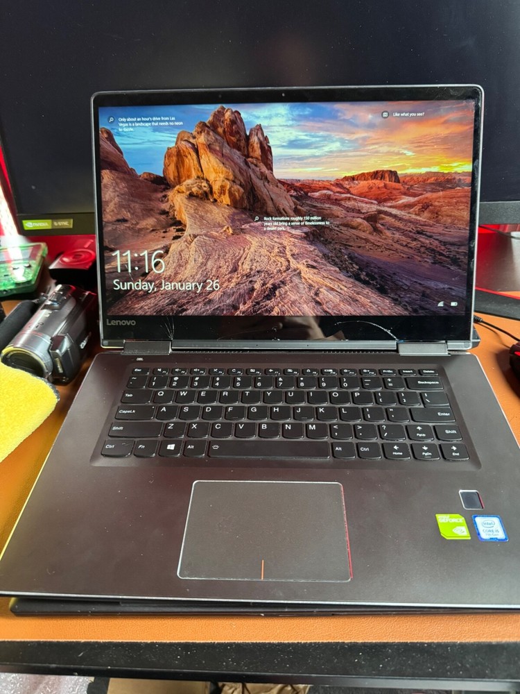 The Lenovo Yoga 710-15IKB is a 15.6" notebook/laptop from the Yoga series, released in 2018. It features an i5-7200U processor with a speed of 2.50 GHz, 8 GB of RAM, and a 256 GB SSD for storage. The laptop has a maximum resolution of 1920 x 1080 and operates on Windows 10 home. READ DESCRIPTION THE LAPTOP WORKS FINE THE ONLY ISSUE IS THE SCREEN HAS A CRACK THAT CAN BE SEEN CLEARLY ON THE PICTURES BUT STILL WORKS FINE WITHOUT MESSING WITH THE RESOLUTION IM GIVING A PAIR OF AIRPODS WITH LAPTOP IF YOU HAVE ANY QUESTIONS FEEL FREE TO MESSAGE ME