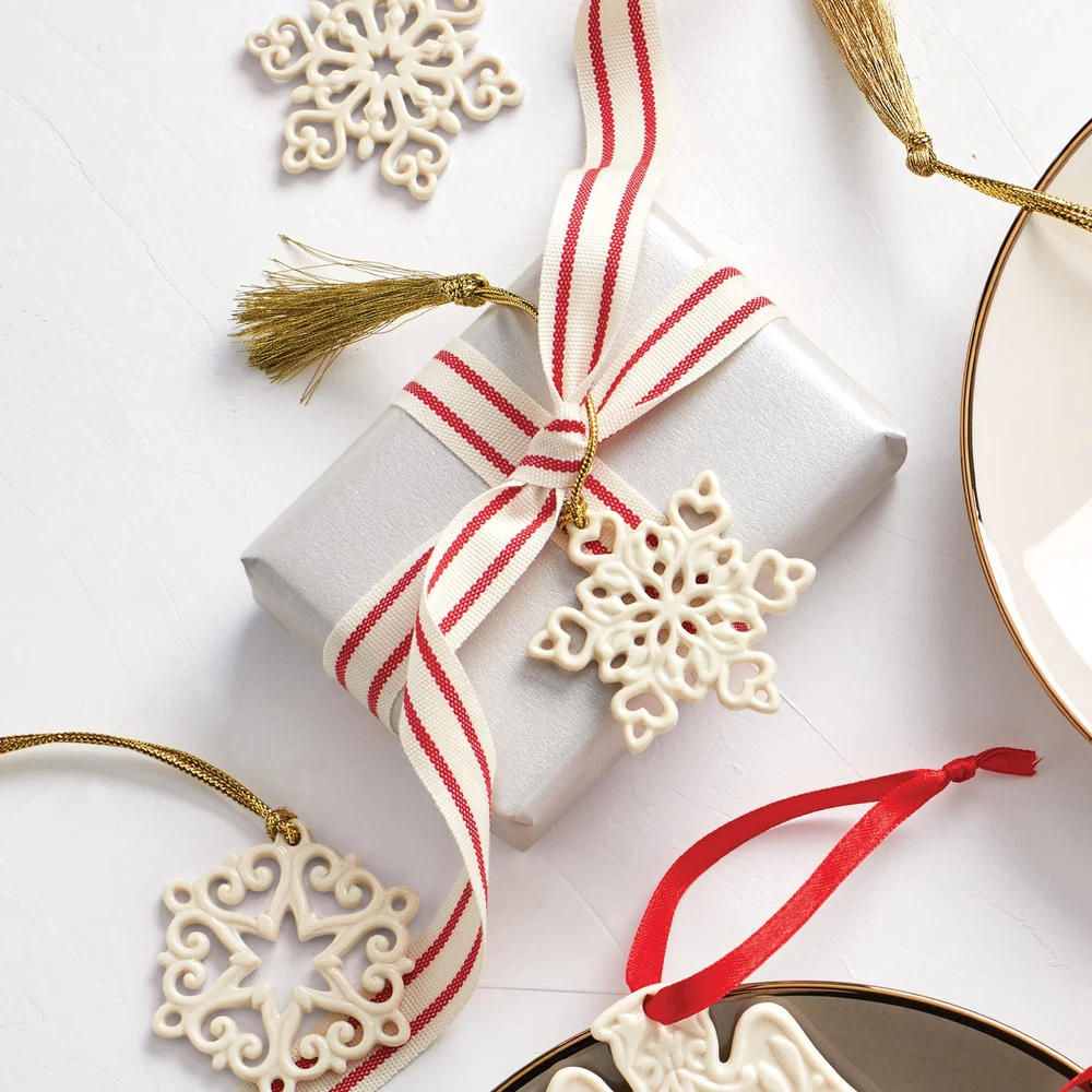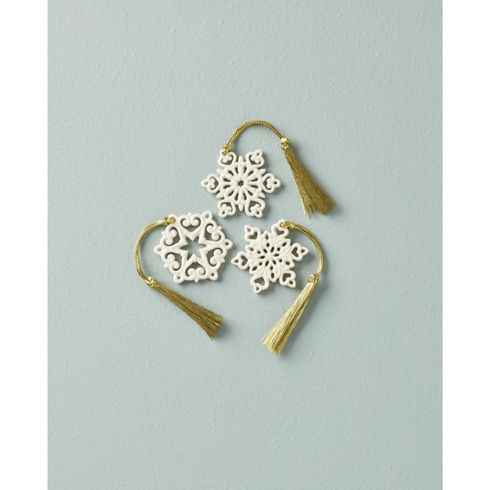 Add a little charm with these mini porcelain snowflakes. This 3-piece set features intricate pierced detailing for a delightful look. It's a great addition to any gift tag or you can use it as an extra place setting marker for your holiday dinners! WHY IT'S SPECIAL: Lenox's mini snowflake ornament set adds a little charm to Christmas with its intricate pierced detailing and delightful snowy finish. They're a great addition to any gift bag, decorative display, or tree! WHO IT'S PERFECT FOR: These snowflake ornaments make a great gift for Christmas lovers who enjoy the snow! Whether they can't get enough of it or don't see any of it, give them a tiny reminder of a the north with these mini snowflake ornaments. WHAT'S IN THE BOX: Includes (3) snowflake ornaments which measure approximately 2" x 2". WHAT IT'S MADE OUT OF: Lenox's snowflake ornament set is crafted of ivory porcelain with a beautiful glossy finish and gold cords for hanging. HOW TO CARE FOR IT: This Lenox Christmas ornament set is meant for display on the tree during the holiday season, but you can keep it out all winter to maintain an atmosphere of cheer!