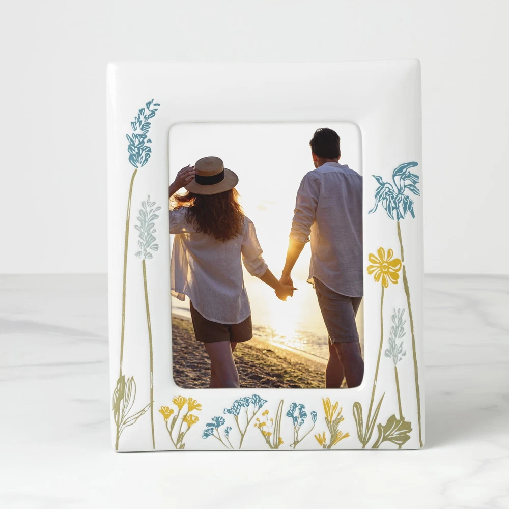 Showcase a special memory inside this pretty floral frame from the Wildflowers collection. With a design featuring simple blooms against a white expanse of sky, it brings extra warmth to the moment preserved within. Collection: Wildflowers Material: stoneware For decorative use Includes (1) picture frame Measures 8.25"H x 10"L Fits 5"W x 7"H photos Imported