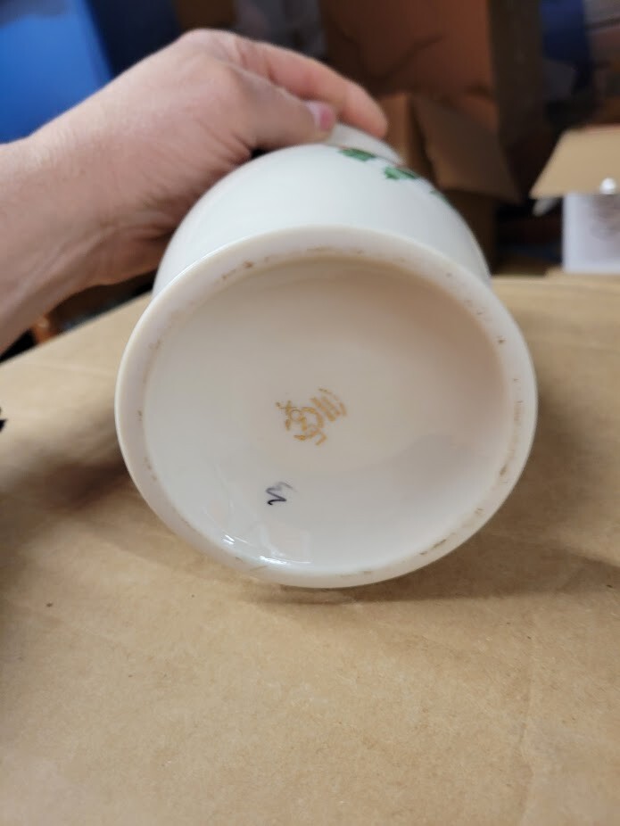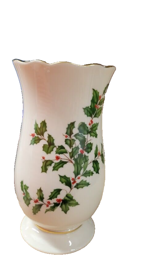 This Lenox Holiday vase is 8 inches tall with a footed design and a scalloped top, made of cream-colored porcelain. Adorned with a festive holly and berries pattern, this elegant vase exudes a holiday theme perfect for seasonal decor. Made in the United States, this vase is a charming addition to any home, adding a touch of Christmas spirit to your living space.