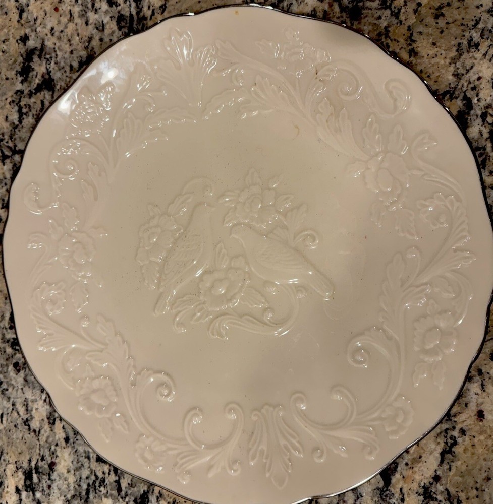The Lenox Anniversary Platter Plate features a Floral pattern with Lovebirds and Peonies in Cream color, perfect for an Anniversary gift. This 12.5 inch round Collector Plate showcases a decorative style and a theme of Love. Perfect for collectors or as a decorative piece in a home.
