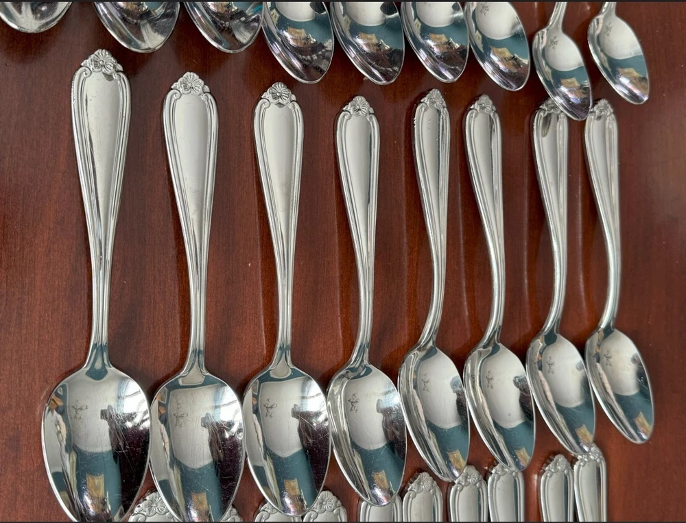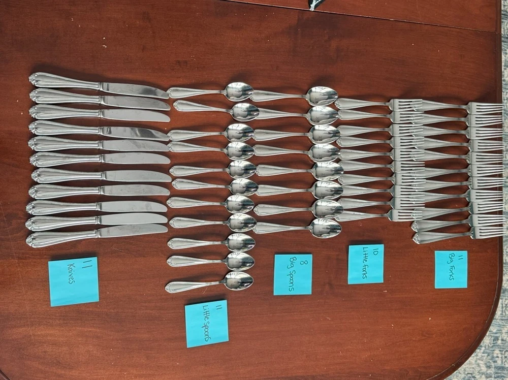 Lenox Bellina flatware. Purchased in 2008. Used. Minor scratches from use but these are in great condition otherwise - very sturdy and strong. This posting is for the larger spoons, but I have forks, spoons, and knives. Totals: 8 larger spoons 11 knives 11 smaller spoons 10 salad forks 11 dinner forks Manufacturer descriptions and dimensions: Bellina is made in a very heavy weight (one of the heaviest patterns we offer with a floral accent). Shiny finish, premium 18/10 stainless steel alloy, and a hollow handle knife, which features a premium cutting blade. This beautiful set of Lenox Flatware Bellina is perfect for adding a touch of elegance to your dining table. Crafted with precision and care, they feature a high-quality stainless steel construction that ensures durability and longevity. Whether you're hosting a formal dinner party or simply enjoying a casual meal with family and friends, these are sure to impress. With their stunning design and superior craftsmanship, they're the perfect addition to any flatware collection. Flatware lengths Salad Fork: 7 1/4" Place Fork: 8" Place Knife: 9 1/8" Soup Spoon: 6 7/8" Teaspoon: 6 1/4"