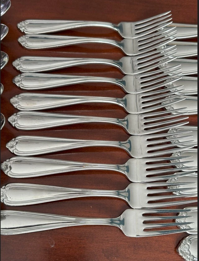 Lenox Bellina flatware. Purchased in 2008. Used. Minor scratches from use but these are in great condition otherwise - very sturdy and strong. This posting is for the salad forks, but I have forks, spoons, and knives. Totals: 10 salad forks 11 knives 11 smaller spoons 8 larger spoons 11 dinner forks Manufacturer descriptions and dimensions: Bellina is made in a very heavy weight (one of the heaviest patterns we offer with a floral accent). Shiny finish, premium 18/10 stainless steel alloy, and a hollow handle knife, which features a premium cutting blade. This beautiful set of Lenox Flatware Bellina is perfect for adding a touch of elegance to your dining table. Crafted with precision and care, they feature a high-quality stainless steel construction that ensures durability and longevity. Whether you're hosting a formal dinner party or simply enjoying a casual meal with family and friends, these are sure to impress. With their stunning design and superior craftsmanship, they're the perfect addition to any flatware collection. Flatware lengths Salad Fork: 7 1/4" Place Fork: 8" Place Knife: 9 1/8" Soup Spoon: 6 7/8" Teaspoon: 6 1/4"