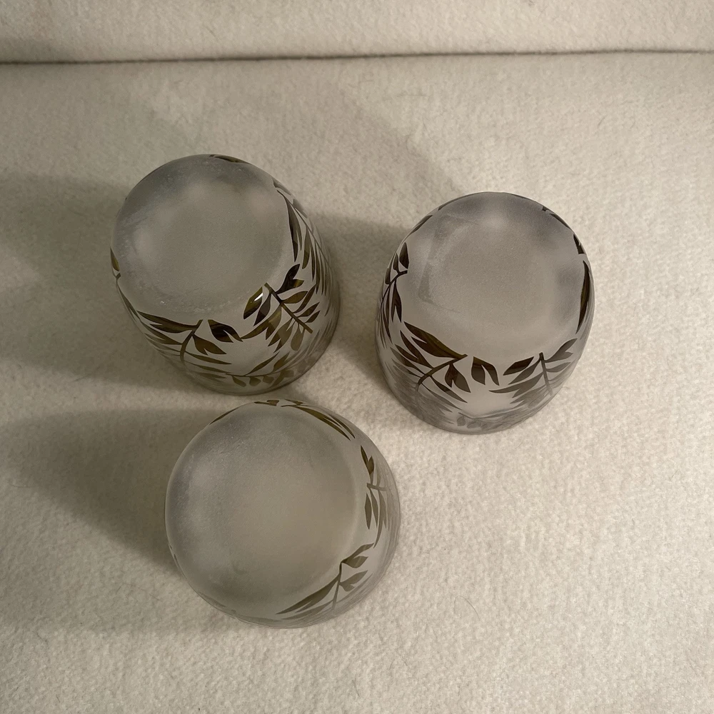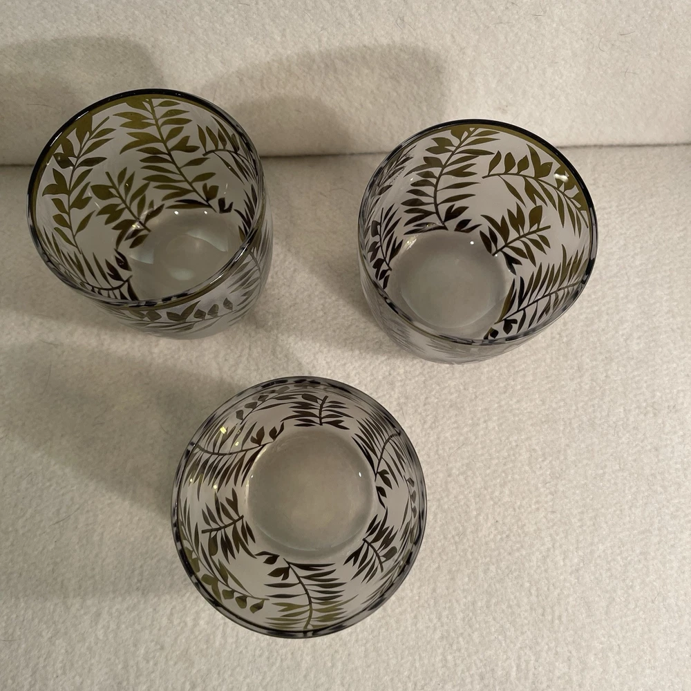 The Lenox Botanical Boutique Green Fern Frosted Votive Candle Holder Set features a modern design with a round shape and a decorative frosted finish. Each glass candle holder in this set of 3 is adorned with a green fern pattern, making them suitable for all occasions. Standing at 3 inches tall and wide, they are designed to hold mini candles and weigh a total of 1.1 lbs. These original Lenox candle holders from the 2000s are perfect for adding a touch of elegance to any space. Excellent condition. New with tags.