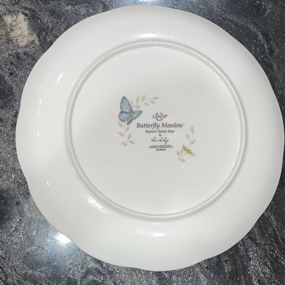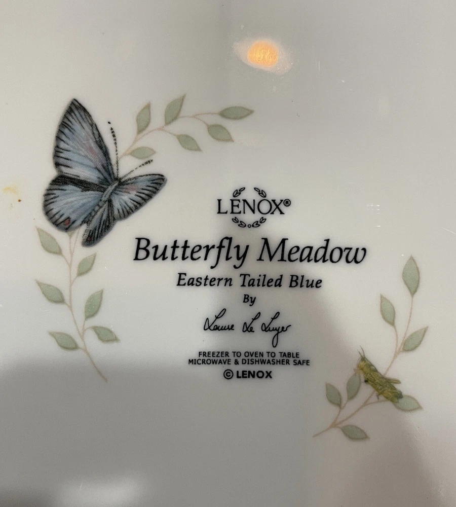 ** There are 9 total but being sold separately. If you would like to buy more than 1 please inquire.** Add a touch of elegance to your dinner table with this beautiful Lenox Butterfly Meadow dinner plate. The round plate has a diameter of 11 inches and features a stunning butterfly and meadow pattern in a glossy finish. Made of high-quality porcelain, this plate is perfect for any occasion, whether it's a formal dinner or a casual gathering with friends and family. The plate is not only microwave and dishwasher safe, but also freezer to oven safe, making it a convenient addition to your dinnerware collection. This original piece from the Butterfly Meadow product line is perfect for those who appreciate art pottery and want to add a touch of sophistication to their home decor. * No Chips or significant wear on any of the plates *