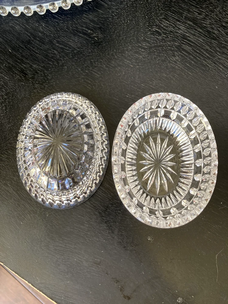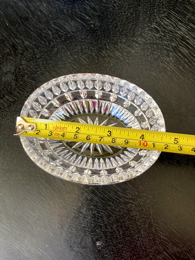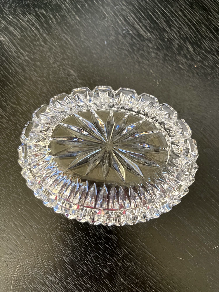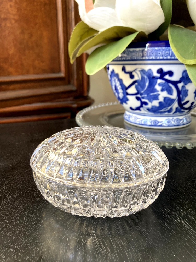 This Lenox Crystal Vintage Oval Trinket Jewelry Box from the 1980s radiates elegance and sophistication. Beautiful cut crystal piece that exudes lots of sparkle. The oval shape adds a touch of classic charm to this timeless piece, making it a perfect accessory for storing jewelry or small trinkets. The Lenox brand ensures high-quality craftsmanship and attention to detail, making this jewelry/trinket box a beautiful and functional addition to any collection or decor. Perfect accessory for a vanity table, bedside table or bathroom counter. A lovely way to keep your jewelry contained until ready to wear again.