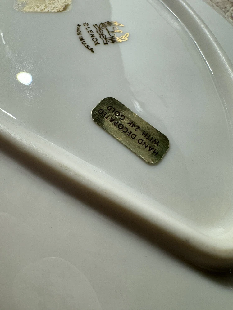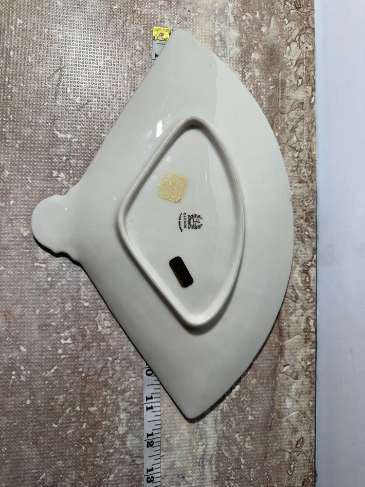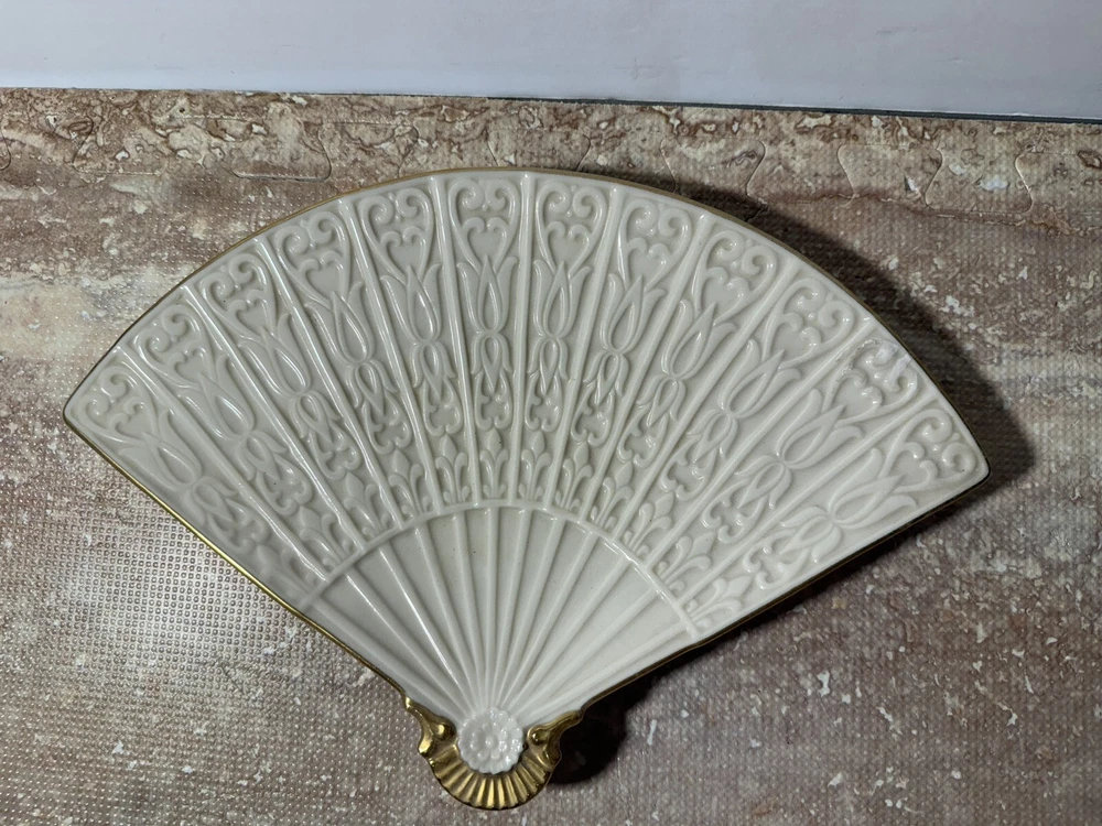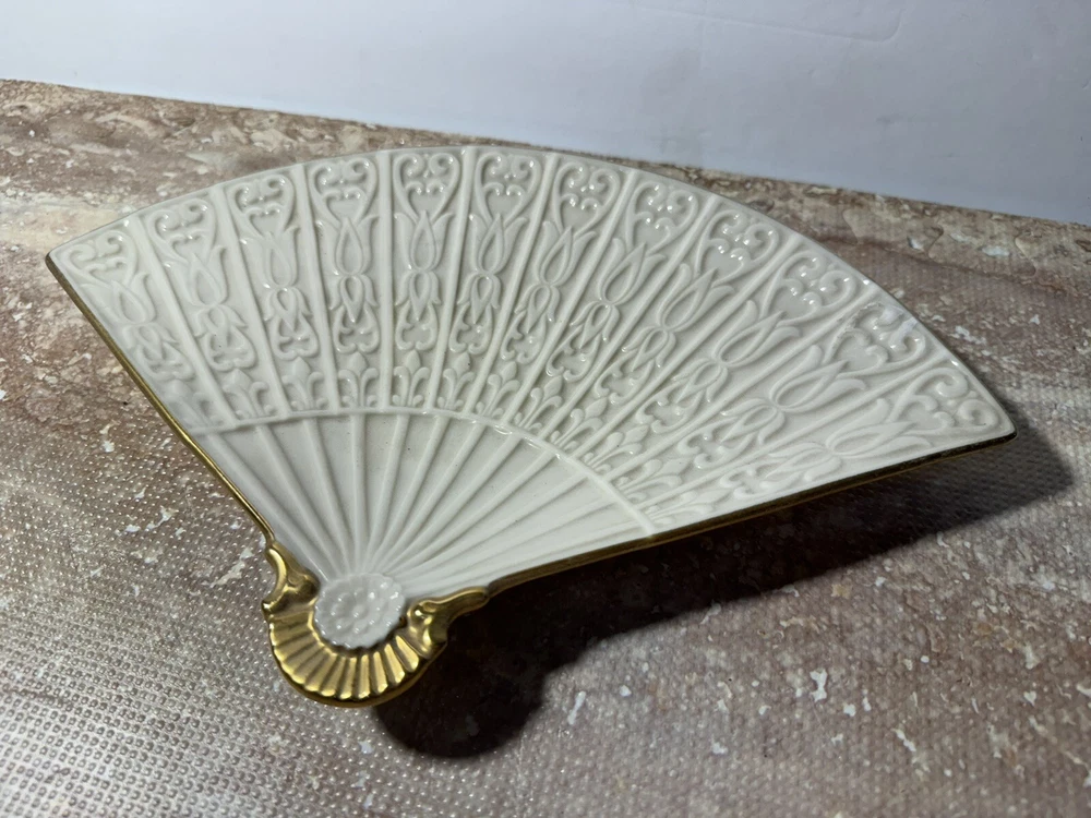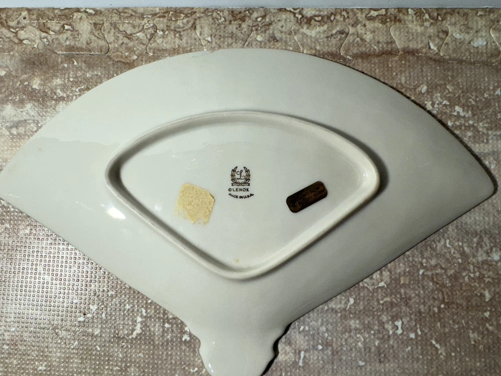 This Lenox Empress fan tray is a beautiful addition to any home decor. The gold trim adds a touch of elegance to the beige porcelain material. It is perfect for serving candy or other small treats and has one compartment for easy storage. The fan shape adds a unique touch to the design. This collectible dish is part of the Lenox Empress set and was made in the United States. It is recommended to hand wash only for proper care instructions. This vintage piece is sure to impress and is a must-have for any pottery and glass collector.