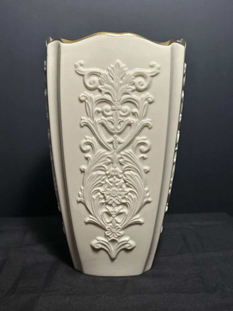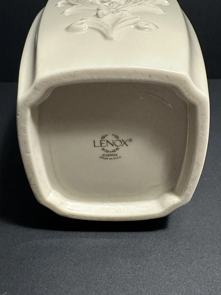 Add a touch of elegance to your home decor with this stunning Lenox Eros Porcelain Vase. Crafted with the finest materials, this vase features a glossy finish and 24K gold trim that adds a touch of luxury to any room. Measuring 9x5 inches, this large vase is perfect for displaying your favorite flowers or as a standalone decorative piece. The white color of the vase complements any interior and makes it an ideal addition to your collection of decorative collectibles. Whether you're a vase collector or looking for a statement piece for your home, this Lenox vase is sure to impress. Excellent condition, no chips or cracks.
