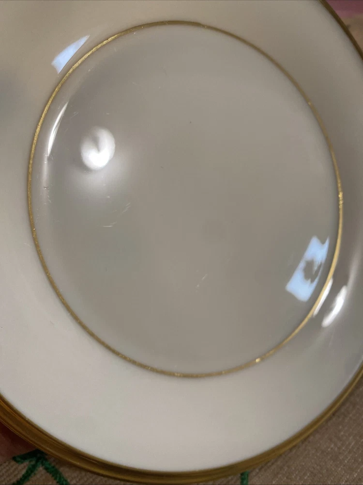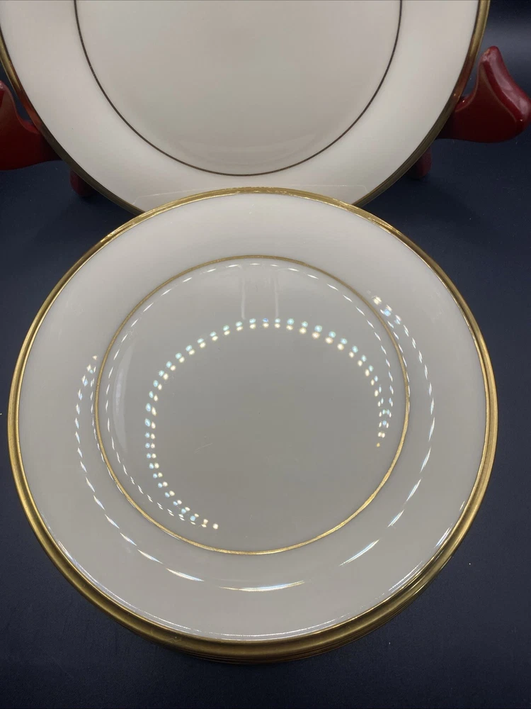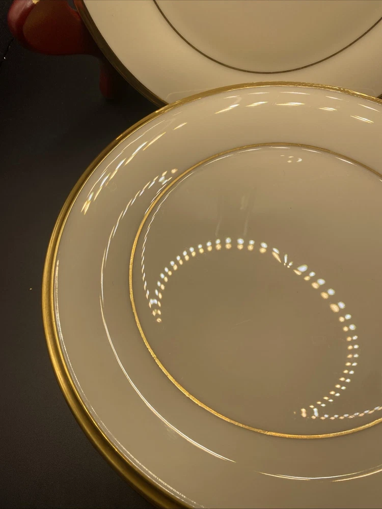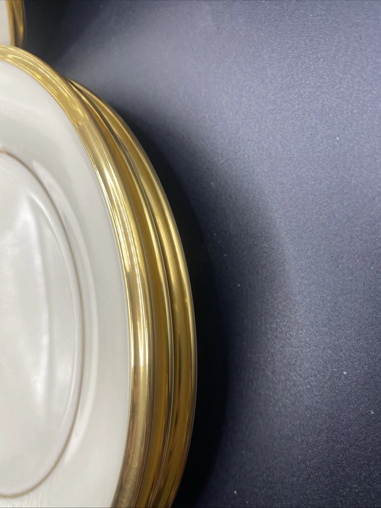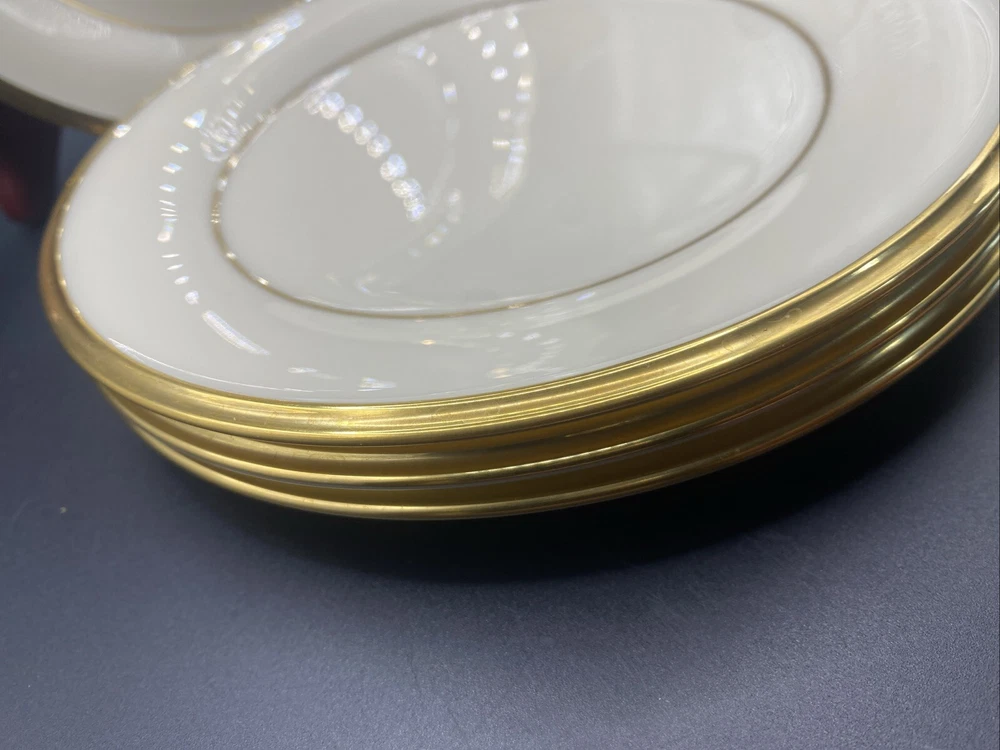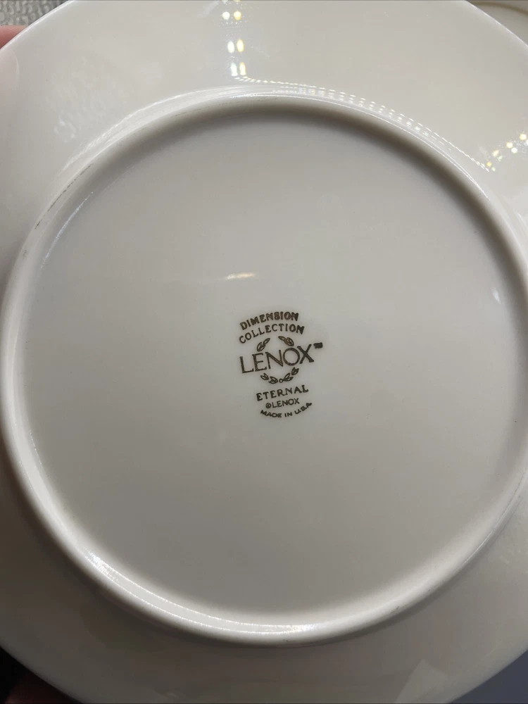 Enhance your dining experience with this exquisite set of four Lenox Eternal bread plates from the Dimension Collection. Each plate measures 6 1/4 inches in diameter and features a classic ivory color with a stunning gold trim. Made from high-quality bone china, these plates are perfect for all occasions, whether a casual breakfast or a formal dinner party. With a vintage look and feel, these plates have a glossy finish and are produced using traditional pottery techniques. The backstamp is printed and the production style is art pottery. The set includes bread plates and is an original product from the United States. Add a touch of elegance to your table setting with this timeless collection from Lenox.