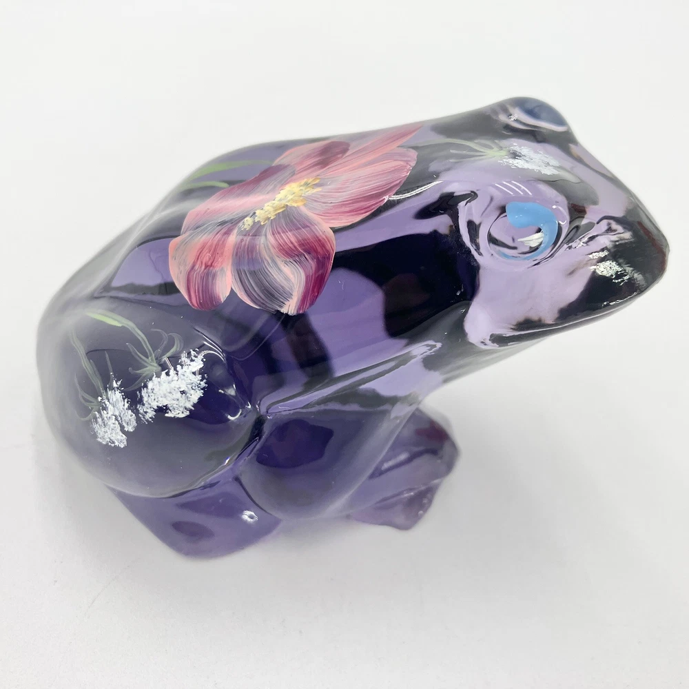 This exquisite figurine of a frog is a stunning addition to any collection. Hand-painted with intricate floral patterns, this LENOX FENTON LILA figurine is made of glossy fused glass and boasts a beautiful purple color. Measuring at 4 inches in length and 2.5 inches in height, this original piece is a perfect representation of the nature-inspired theme of frogs and flowers. The figurine is signed and comes with a backstamp impressed from the production style of art glass. Produced in 2005 in the United States, this decorative piece is a part of the Lila The Little Purple Frog product line. It is a perfect item for those who love animals, nature, and beautiful art glass. CONDITION: Pre-owned in good condition. No chips, cracks, damage. Comes with original sticker. ****SHIPS NEXT BUSINESS DAY***