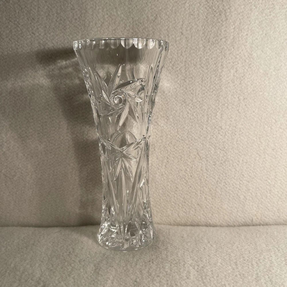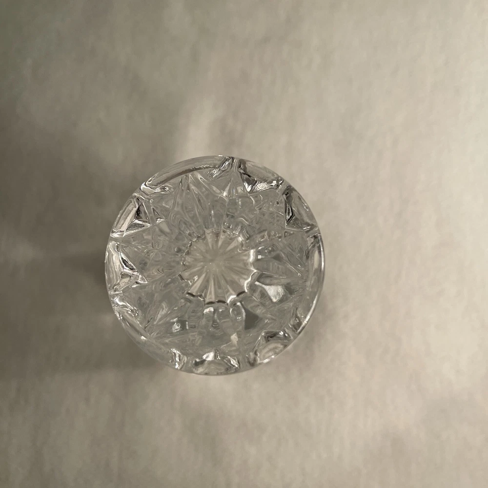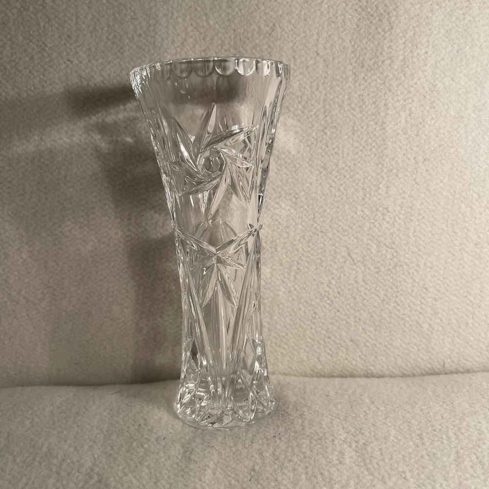This Lenox Fine Crystal Bud Vase measures 6 inches in height and has a round shape with a swirl star pattern. Made in the Czech Republic in the 1980s, this traditional style vase is crafted from clear crystal with a patterned finish. It is adorned with stars and has a width of 2.5 inches, weighing 12.9 ounces. Perfect for all occasions, this original piece from Lenox is a beautiful and elegant addition to any decorative collection. Excellent condition. No chips or cracks.