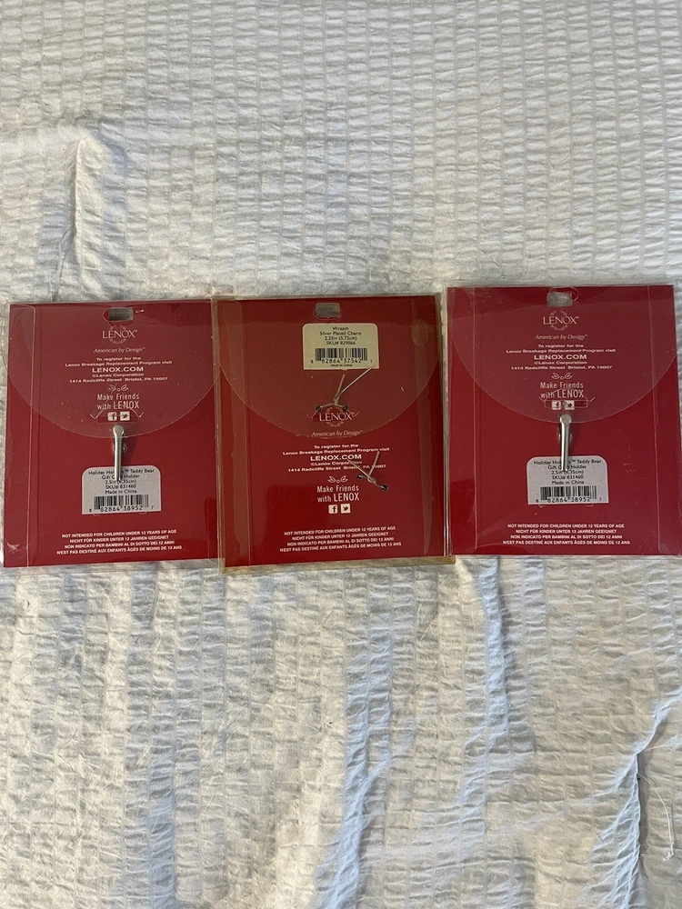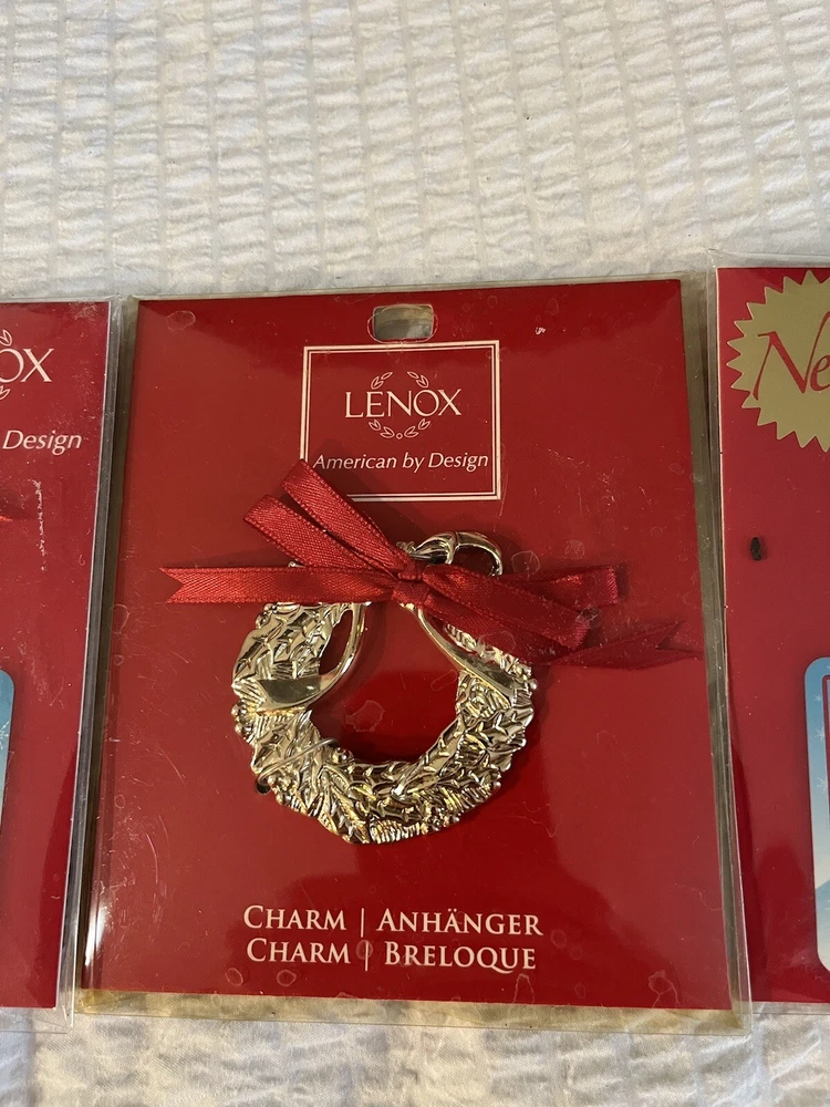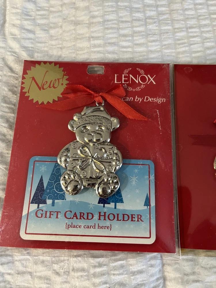 Lenox Gift Card Holders. Set of 2 bears and 1 Lenox charm wreath. The bears are silver and the wreath charm is gold. New, never used. Measure appropriately 2” tall.