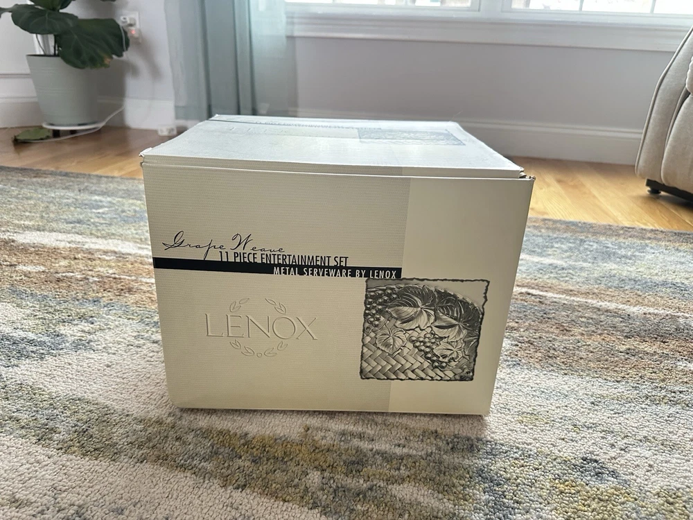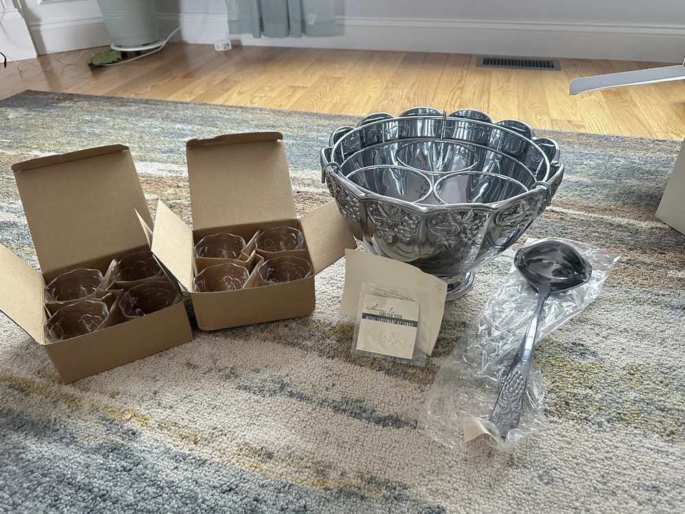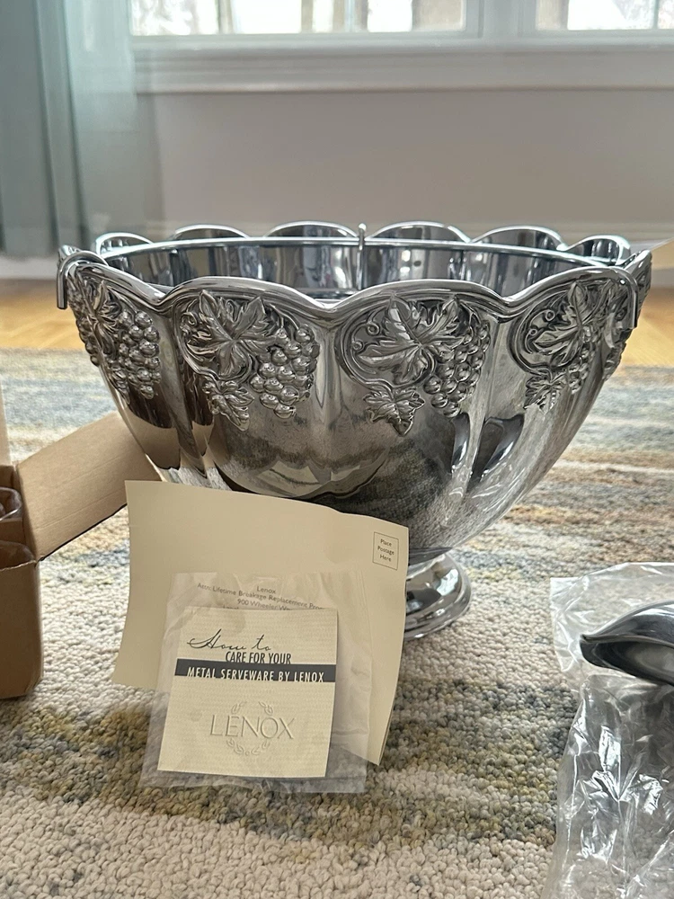 Features: Decorative Time Period Manufactured: 2000-2009 Era: 21st Century (2000-now) MPN: 6211254 Product Line: Grape Weave Metal Serveware Item Height: 8 1/2" (Bowl) Manufactured: 2003 - 2007 Department: Adult Color: Silver & Clear Custom Bundle: Yes Bundle Description: 1 Lot of 11 items Original/Licensed Reproduction: Original Number of Items in Set: Eleven-Piece Country/Region of Manufacture: China Brand: Lenox Type: Punch Bowl Set Pattern: Grape Weave Status: Discontinued Handmade: No Finish: Glossy Backstamp: Impressed Item Diameter: 12 1/2" (Bowl) Style: Mid-Century Modern Shape: Round Care Instructions: Hand Wash Only Vintage: Yes Material: Glass, Metal Alloy Theme: Grape Weave Antique: No Set Includes: Punch Bowl, Ladle, Metal Bottle Holder, 8 Glasses Occasion: All Occasions