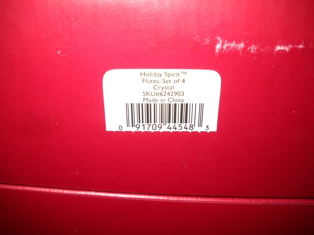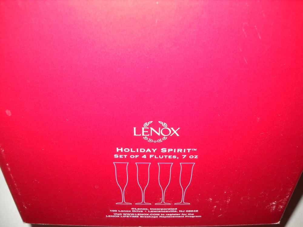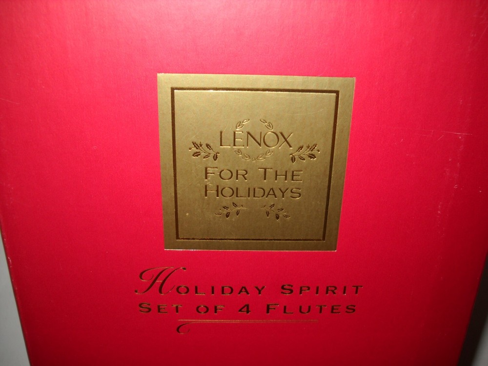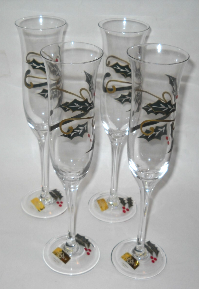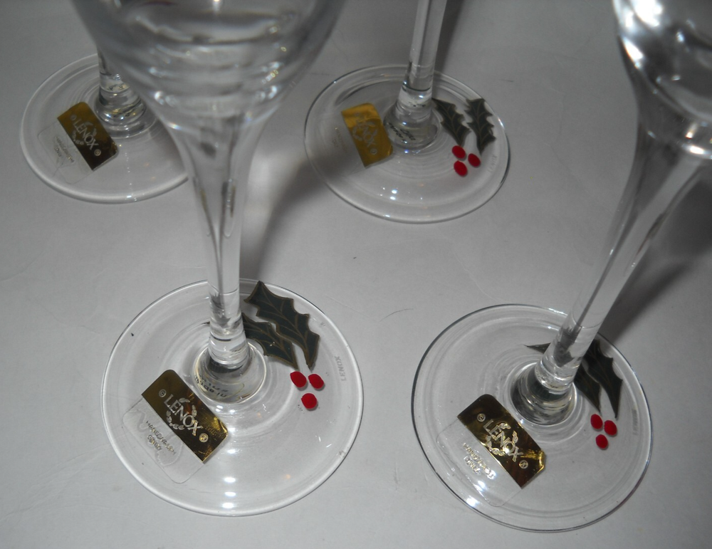 Lenox Holiday Spirit Champagne Flutes. Set of 4 These are lovely, 10 1/2" tall, 7 oz. champagne flutes. Made of crystal with a handpainted holly and gold ribbon design. New in original box, stickers on each glass. Box has wear as described. Smoke Free.