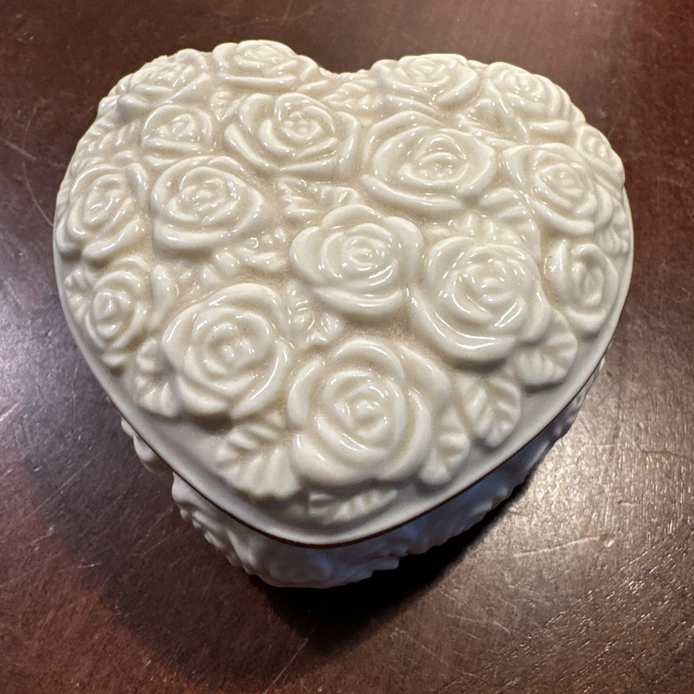 This Lenox trinket box is a beautiful addition to any collection. Its heart-shaped design with roses pattern makes it a perfect gift for any occasion. The box is made of high-quality porcelain with a glossy finish, and it comes boxed for safekeeping. It is a contemporary style box that is suitable for adults, with a small size that makes it easy to carry around. The box features a rose subject, and it was manufactured in China during the 2000-2009 time period. The Lenox brand is well-known for producing high-quality collectibles, and this trinket box is no exception.