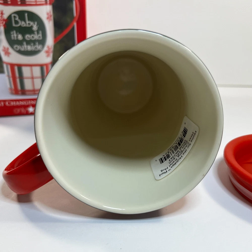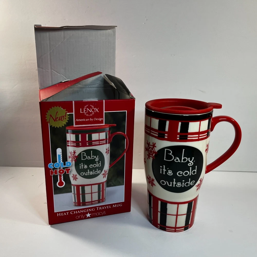 Lenox Heat Changing Travel Mug "Baby It's Cold Outside" Home for the Holiday Plaid Holds 20 oz 867363 Made of ceramic with a plastic lid Comes new with tags The Black changes to Blue when Heated