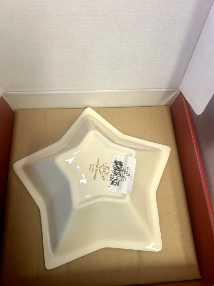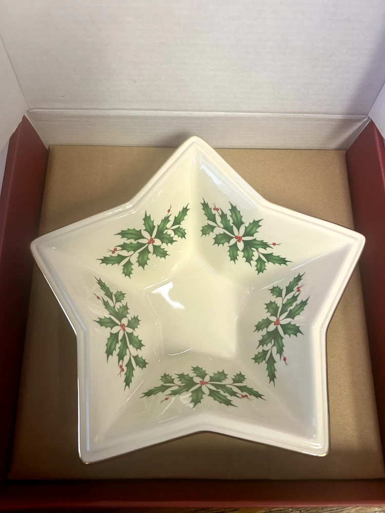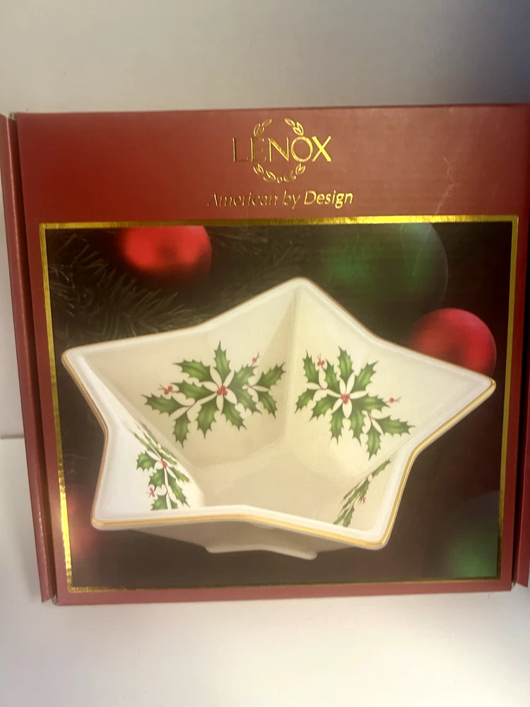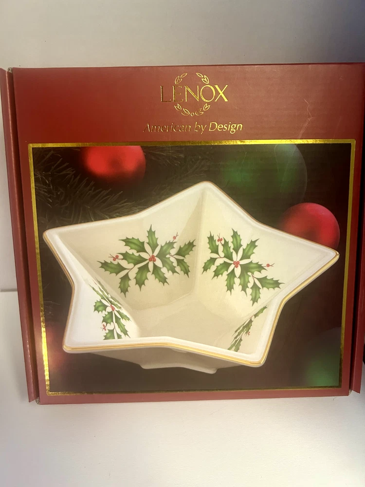 Item Width:8 inBrand:LenoxTheme:Christmas hollyItem Depth:n/aUPC:Does not applyNumber of Place Settings:1Item Height:2.5 inchesShape:Stargtin13:Does not applyItem Length:n/aAntique:NoPattern:StarsFinish:GlossyBowl Diameter:8 inOriginal/Reproduction:OriginalDepartment:AdultNumber of Items in Set:1Country/Region of Manufacture:ChinaOccasion:Christmas, WinterColor:cream gold green redModel:star bowlCulture:AmericanType:BowlSet Includes:BowlMaterial:PorcelainCare Instructions:Hand Wash OnlyCharacter:n/a