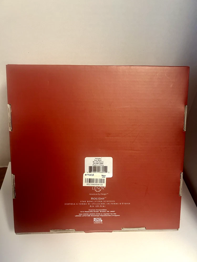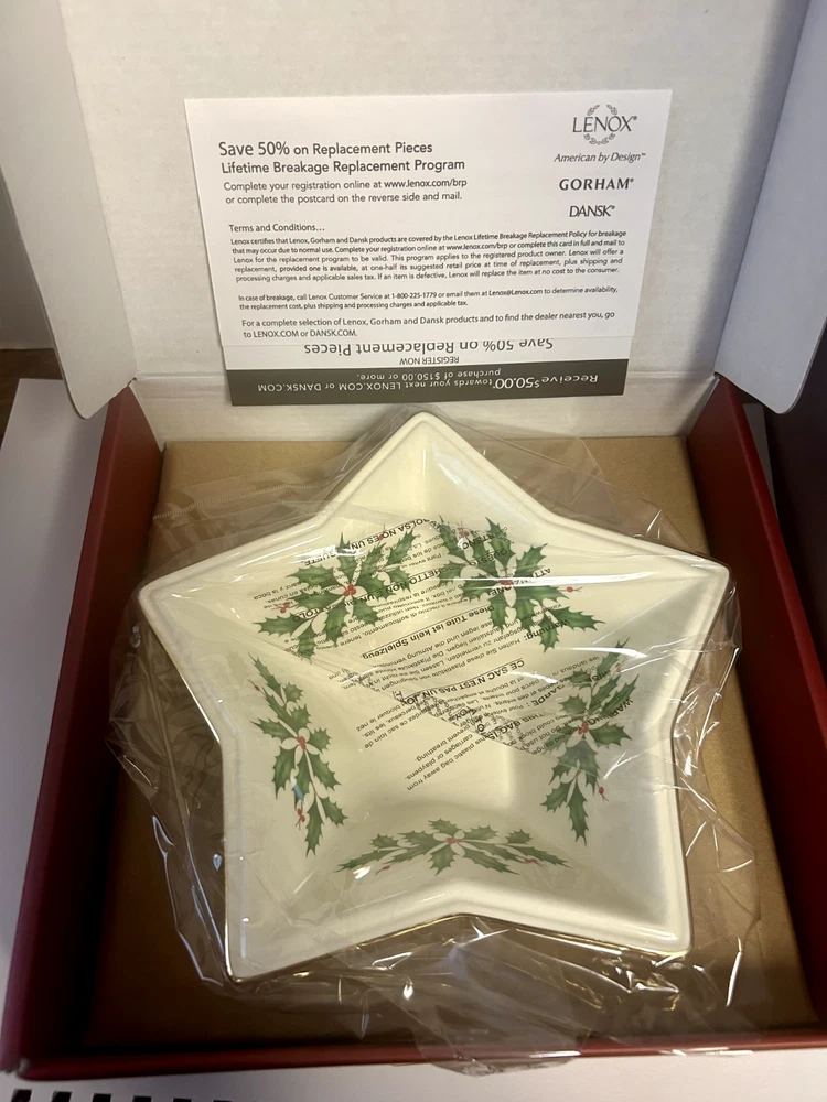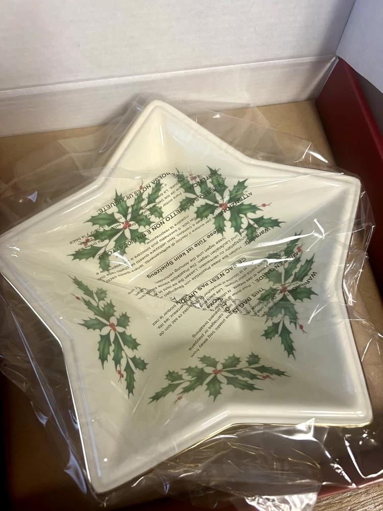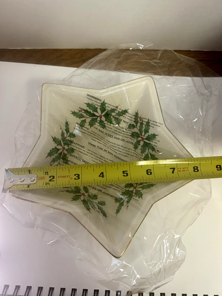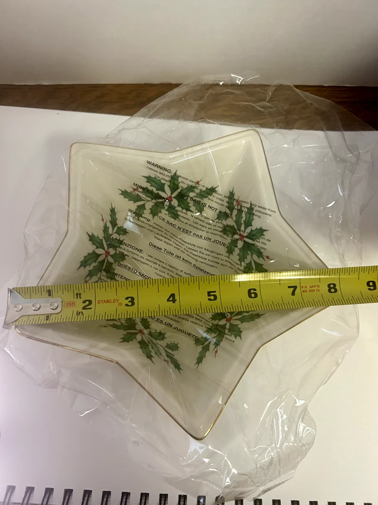 Item Width:8 inBrand:LenoxTheme:Christmas hollyItem Depth:n/aUPC:Does not applyNumber of Place Settings:1Item Height:2.5 inchesShape:Stargtin13:Does not applyItem Length:n/aAntique:NoPattern:StarsFinish:GlossyBowl Diameter:8 inOriginal/Reproduction:OriginalDepartment:AdultNumber of Items in Set:1Country/Region of Manufacture:ChinaOccasion:Christmas, WinterColor:cream gold green redModel:star bowlCulture:AmericanType:BowlSet Includes:BowlMaterial:PorcelainCare Instructions:Hand Wash OnlyCharacter:n/a