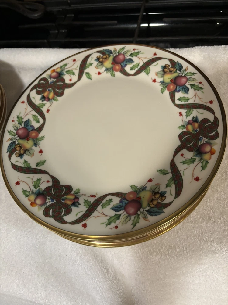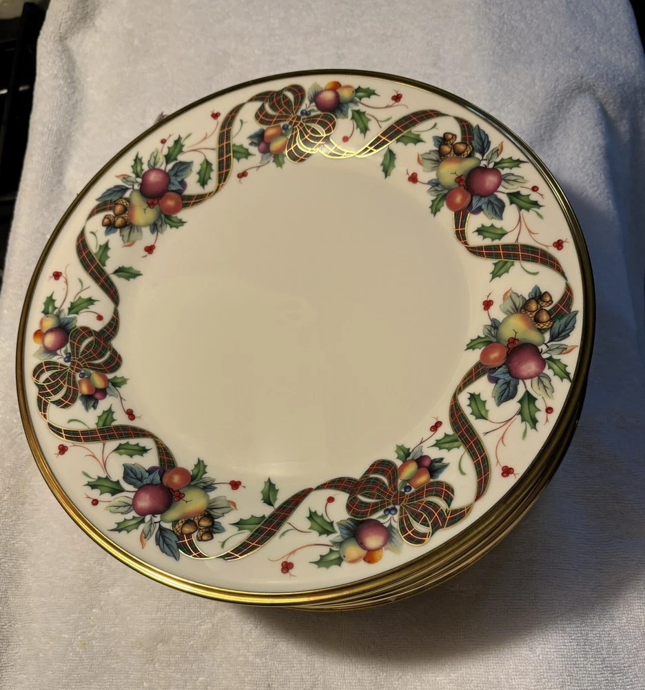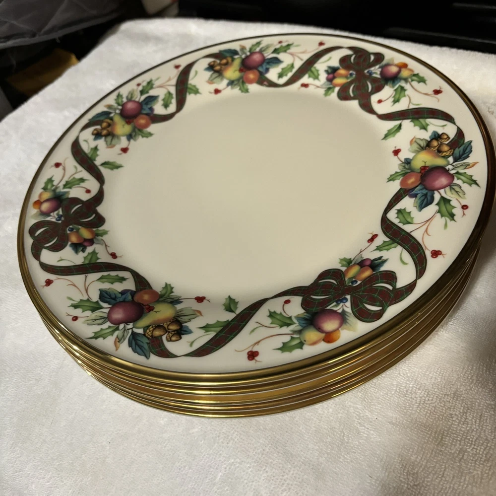 Dinner Plates are 10 3/4" Dia. Replacements and other Ebay sellers list these as high as $80/plate. This is a retired pattern but still widely available online. The pattern has a rich border of fruit, nuts, holly and a tartan ribbon accented with a 24K gold rim. It is perfect for any fall dinner but especially Thanksgiving and Christmas. It still shines like new with no scratches or chips. See my other listings for additional pieces to this pattern. As noted in condition, they are pre-owned but do not look as if they have been used at all. Please ask for more photos if you want them. Holidays COULD POSSIBLY impact shipping/handling time; just connect with me if you are in a hurry and I will do what I can to expedite. :)