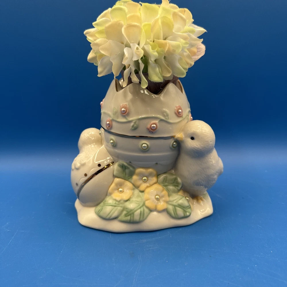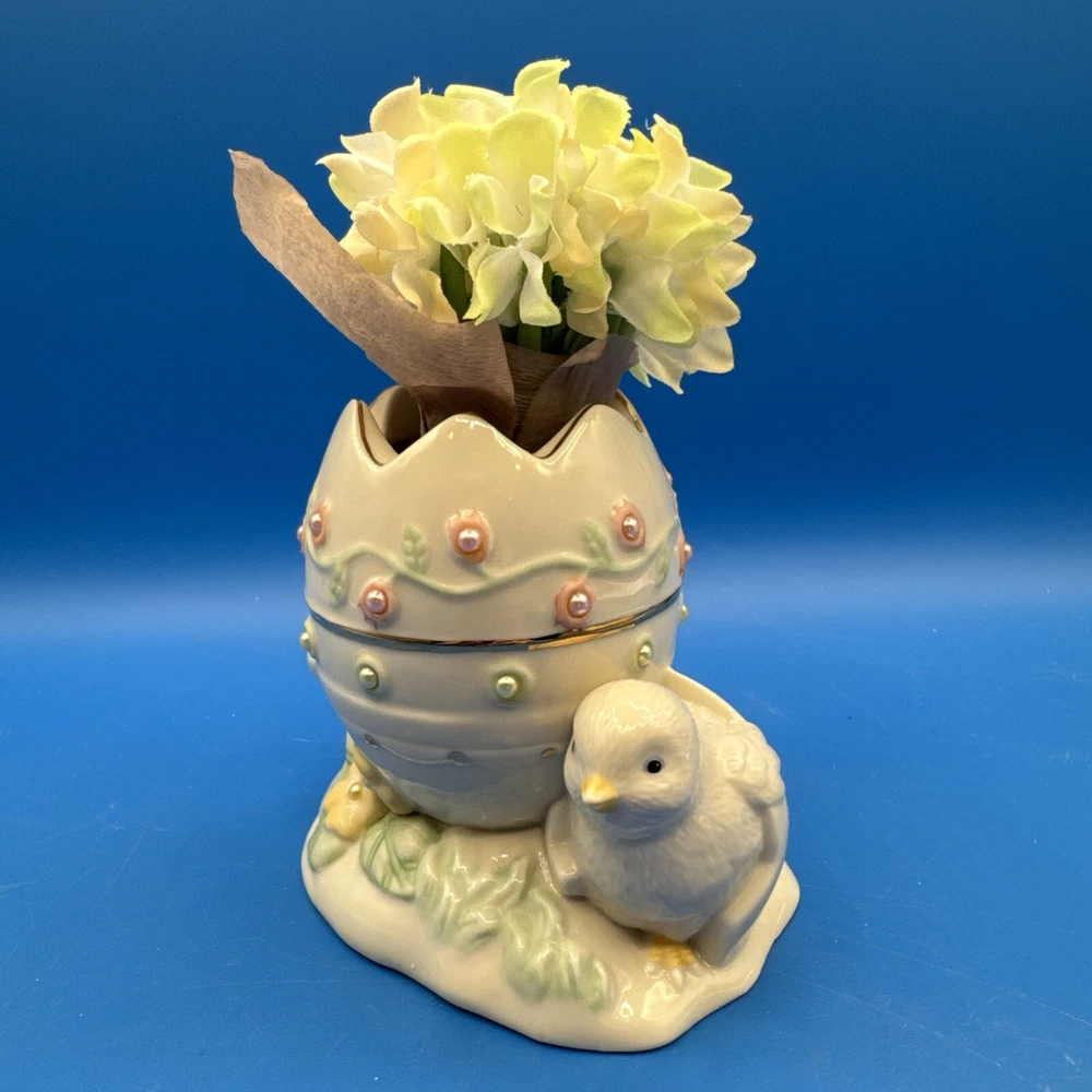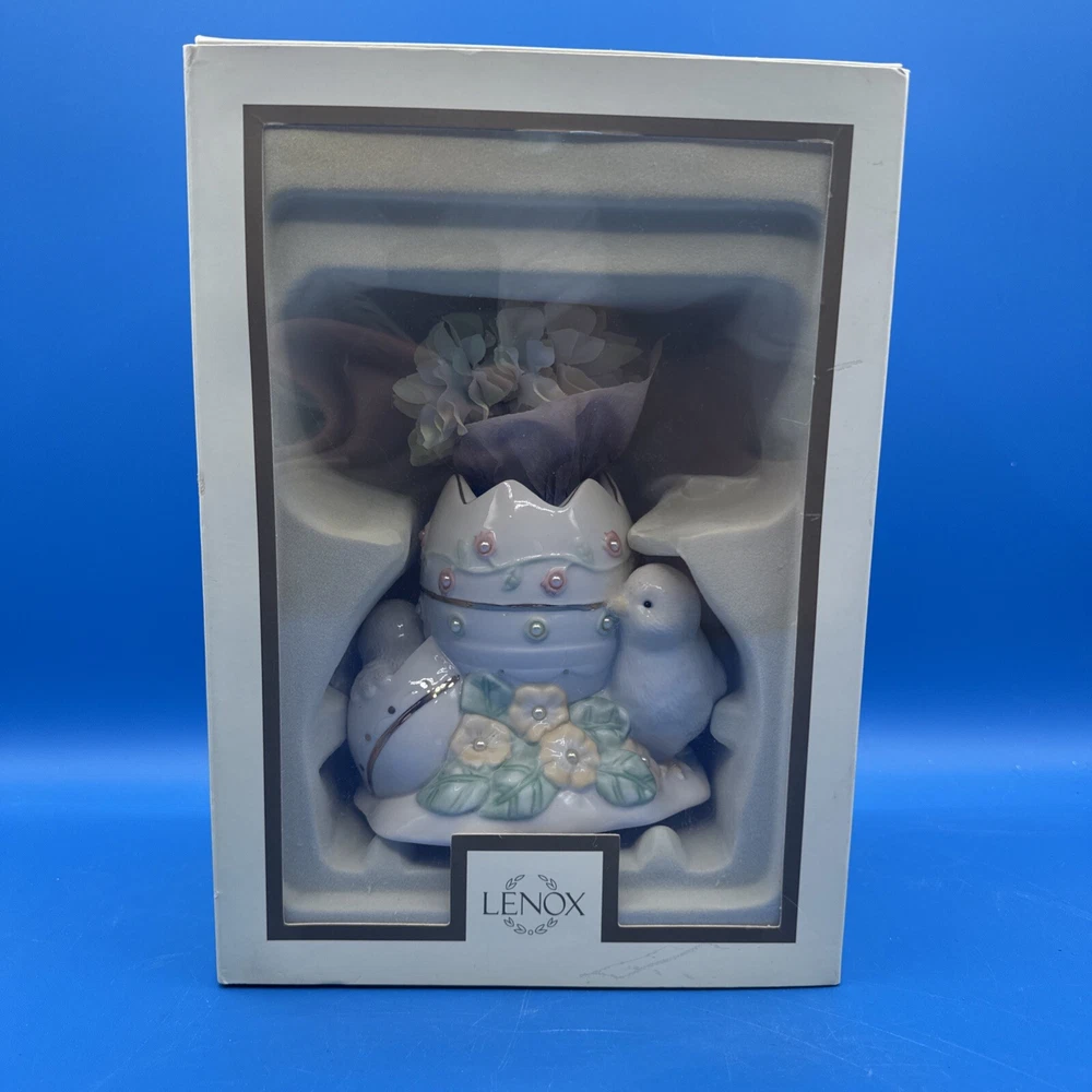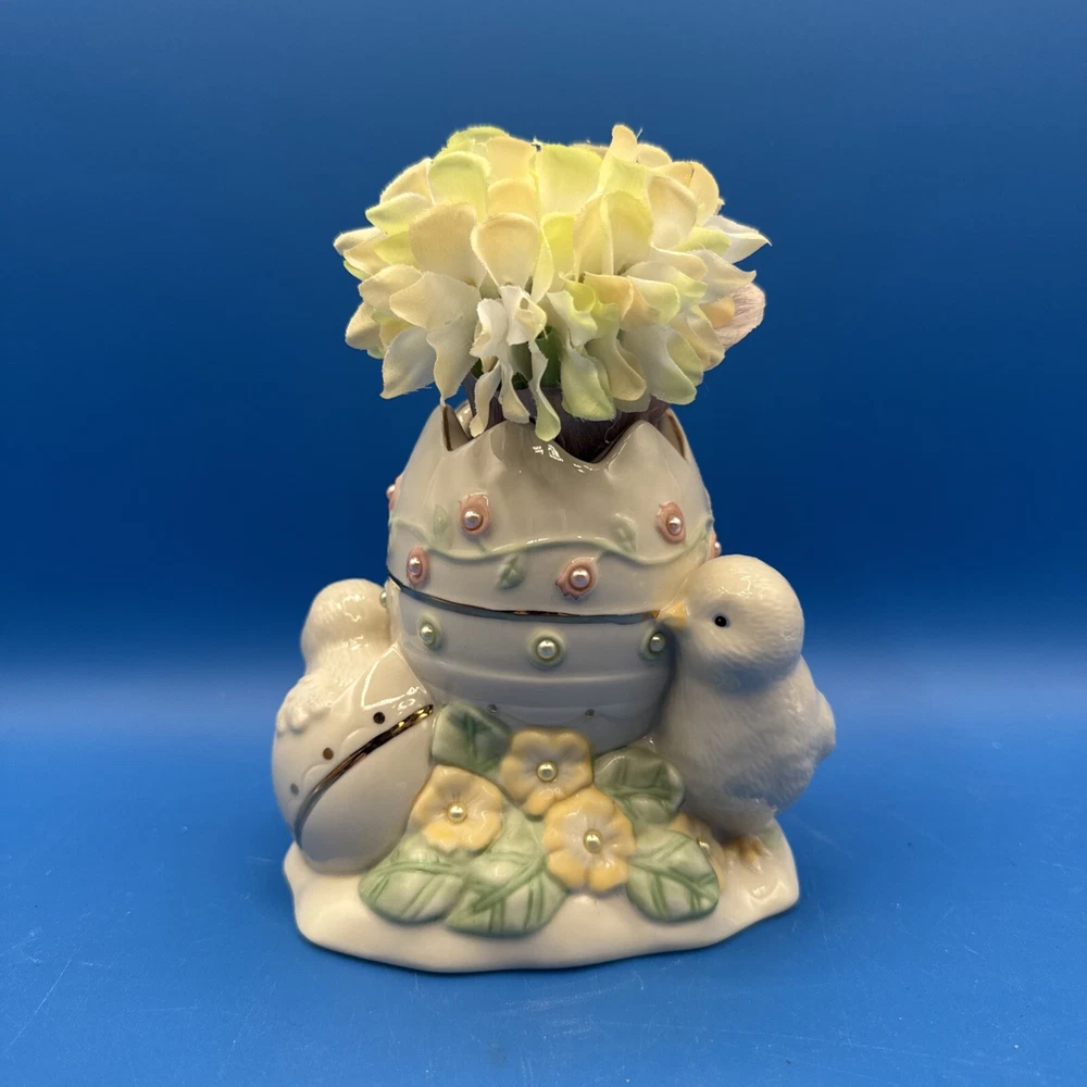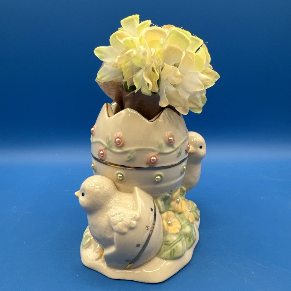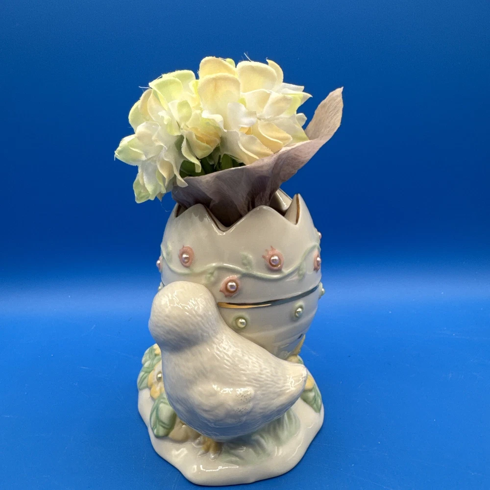 This Lenox Miniature Vase features a charming Easter-themed design, with a chick holding an egg on a bud vase adorned with ivory and gold trim. Made of porcelain in China, the vase is detailed with petals and pearls, adding a whimsical touch to any collection. Open box. Excellent condition. No cracks or damages. Comes with original box. Please check the pictures carefully as part of the description. Feel free to ask questions if you need more information before you buy it. Thank you for your interest B-15