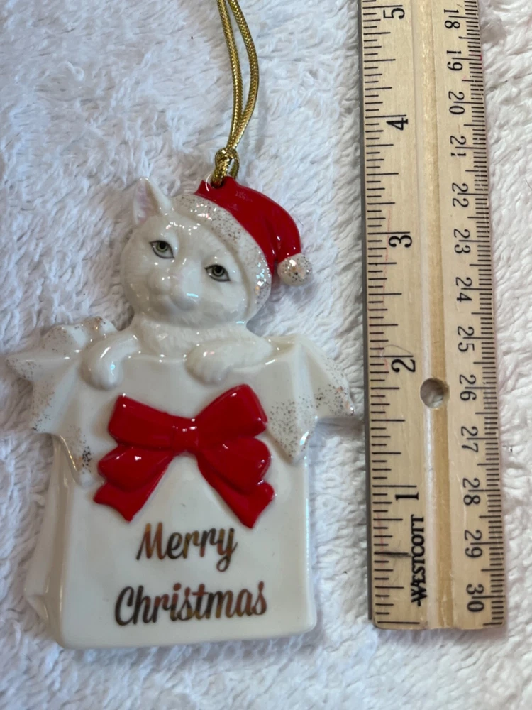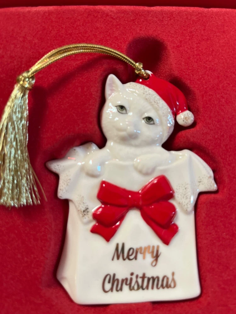 Add a touch of festive feline charm to your Christmas tree with the Lenox Kitty Christmas Ornament. This delightful porcelain cat is adorned with a vibrant red Santa hat, sure to bring a smile to any cat lover's face. The ornament, a product of the renowned 2009 collection, stands at a quaint 3.5 inches, making it a perfect addition to any holiday display.This special hanging decoration comes in its original box, marked with the MPN 838317, showcasing the intricate 'CAT' pattern designed to capture the spirit of Christmas. Whether you're starting a new collection or adding to an existing one, this Lenox ornament is a timeless piece that celebrates the holiday season and the warmth of home.