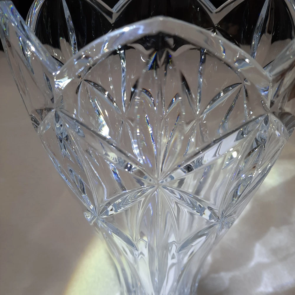 The Lenox Heavy Crystal Vase is a stunning 14" tall vase featuring a Shooting Stars pattern. Made of full lead crystal, this contemporary vase is elegantly designed with a glossy finish, perfect for all occasions, including weddings and everyday celebrations. With a clear color and a weight of 7 lb 9oz, this original Lenox vase showcases a beautiful flower design and is ideal for displaying fresh or artificial flowers in an adult's living space. It is recommended to clean this vase with warm water to maintain its pristine appearance.