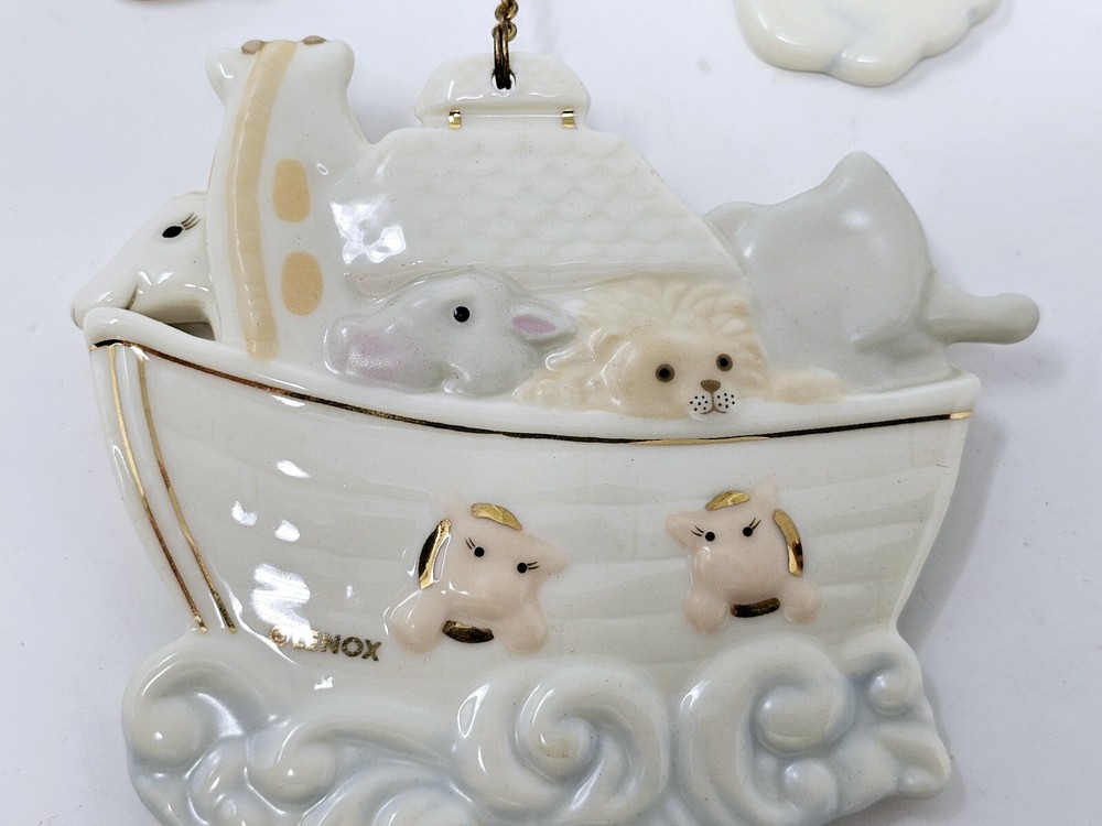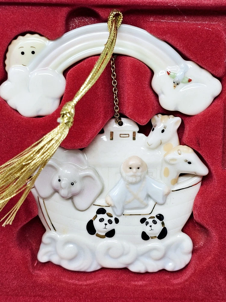 Lenox Noah's Ark with Rainbow Porcelain Ornament #6119044 with Box Christmas Nice clean ornaments. Box in good shape. This exquisite Lenox porcelain ornament is a must-have for collectors and enthusiasts out there. Celebrate the holiday season in style with this medium-sized ornament that showcases a boat and rainbow design, depicting Noah's Ark. This vintage item was manufactured in 1999 and comes with its original box. Featuring a hanging feature, this Lenox Noah's Ark ornament is perfect for your Christmas tree or as a decorative element in your home. The ornament measures 3.75 inches in width and is in excellent condition. Add this to your collection today and make your holiday season more colorful with this beautiful Rainbow Porcelain Ornament.