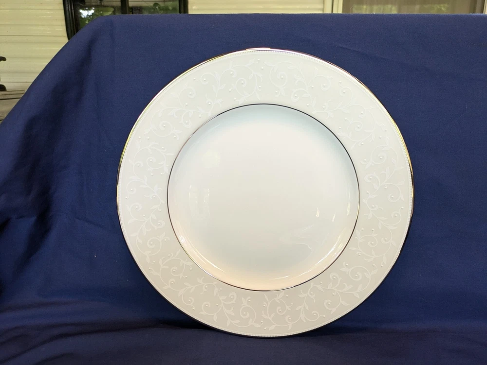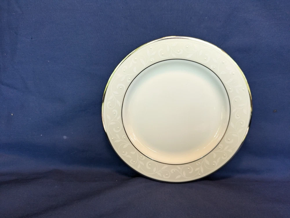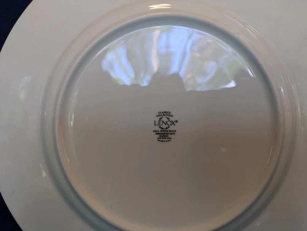Lenox Opal Innocence 3 Piece Place Setting Dinner- Salad- Bread Plate. The dinner plate has a couple of light scratches. The dinner plate is about 10 7/8", the salad plate is about 8 1/8", and the bread plate is about 6 1/2". Thanks for looking!!