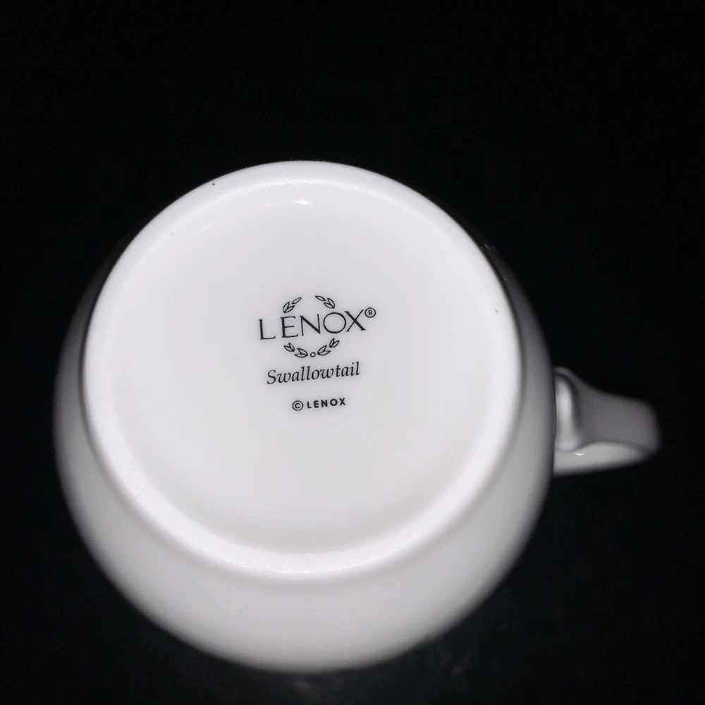 The Lenox Swallowtail Replacement Mug is part of the Butterfly Meadow Collection, featuring a round shape with a painted multicolor Swallowtail butterfly pattern on porcelain material. This small mug is suitable for hot beverages and has an item diameter of 3 and 1/4 inches, height of 4 and 1/4 inches, and width of 3.5 inches. It is designed for one person and comes as a single coffee cup/mug branded by Lenox, making it an elegant and artistic addition to any collection or table setting. Crafted in USA, Indonesia and China. New but has been rinsed off and dried.