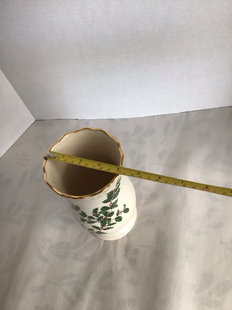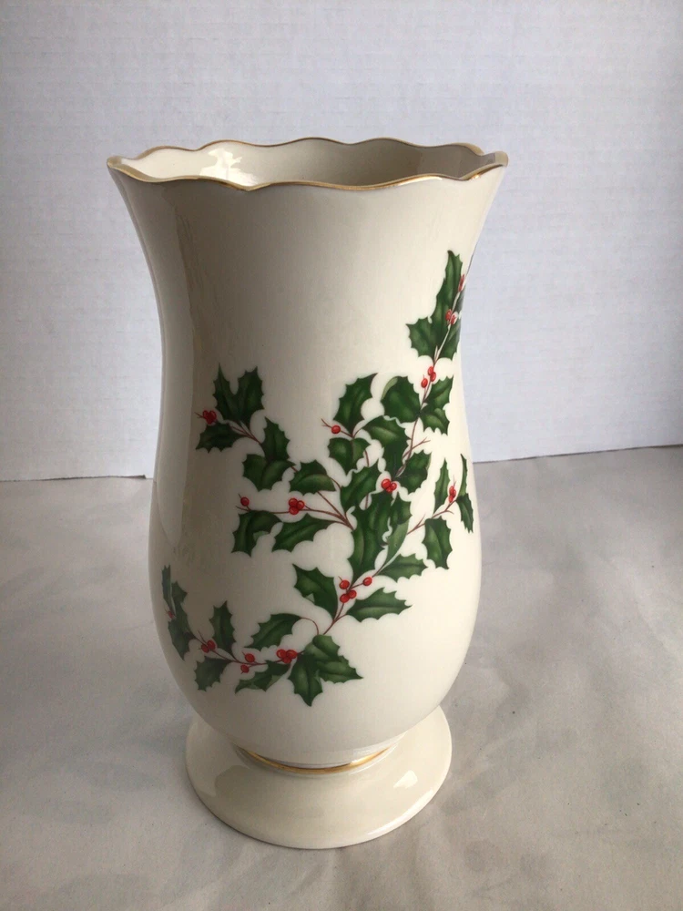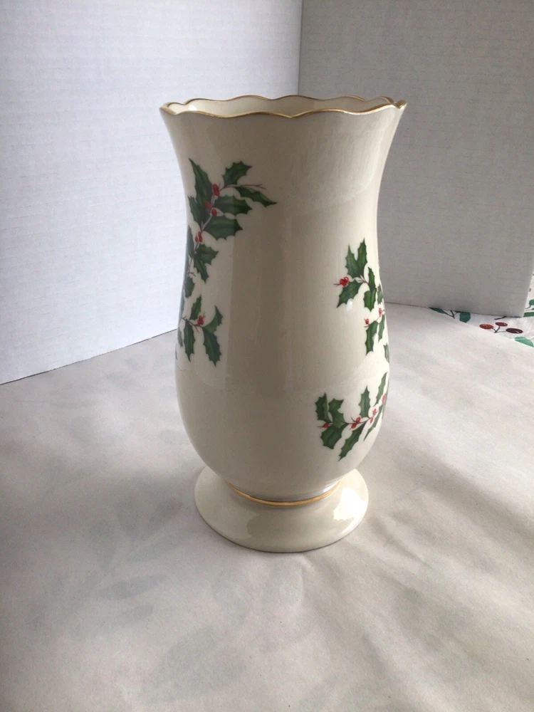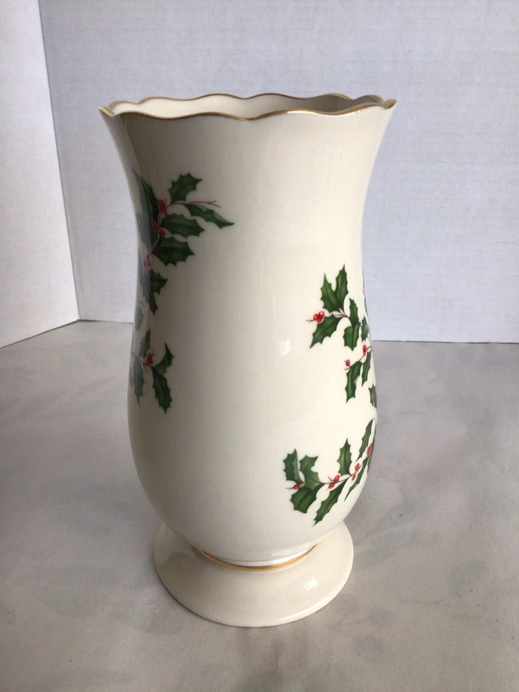 This Lenox porcelain vase is perfect for adding a touch of elegance to your holiday decor. The vase features a beautiful holly pattern with gold trim and a scalloped edge. Measuring 8 inches in height and 5 inches in width, this ivory vase is perfect for holding your favorite flowers or as a decorative piece on its own. Made in the United States with high-quality porcelain and a glazed finish, this vase is sure to last for years to come.