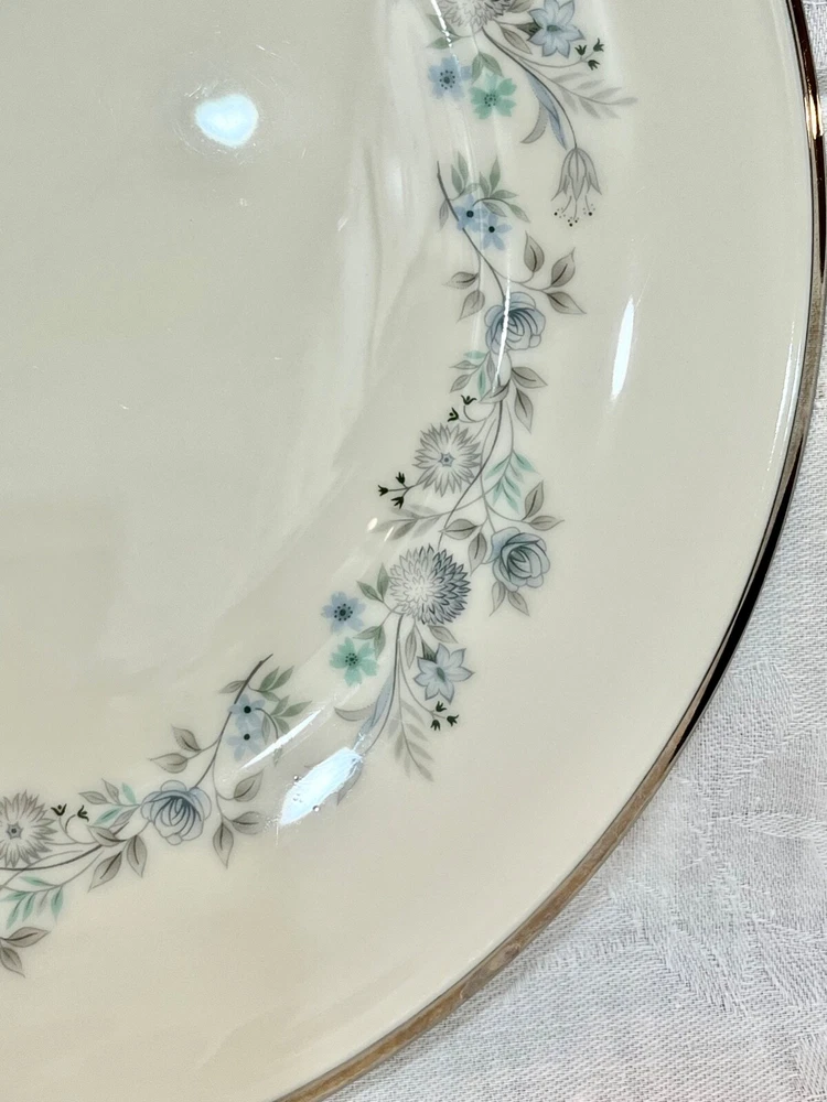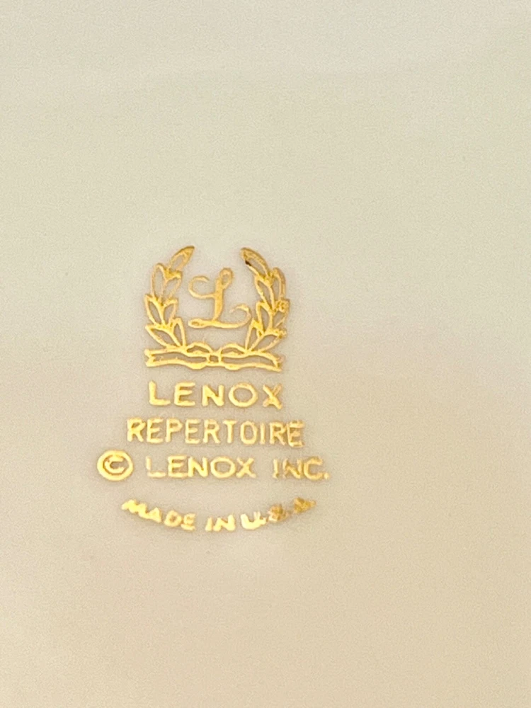 Here is a Lenox Repertoire Dinner Plate. It has a pretty blue green floral design with a platinum rim. I have 8 of them and message me if you want all 8. I will give you a deal and I combine shipping of course. Otherwise I am selling one at a time.