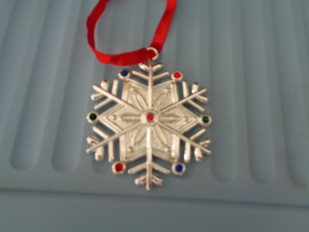 Let it snow! This silver snowflake features a unique, detailed shape and is crafted with multicolored gems around the edge. Cover your Christmas tree with some extra special snowflakes! Material: Sterlingplate Red Ribbon For Hanging Imported Decorative Ornament Height: 2.5" Length: 2.5"