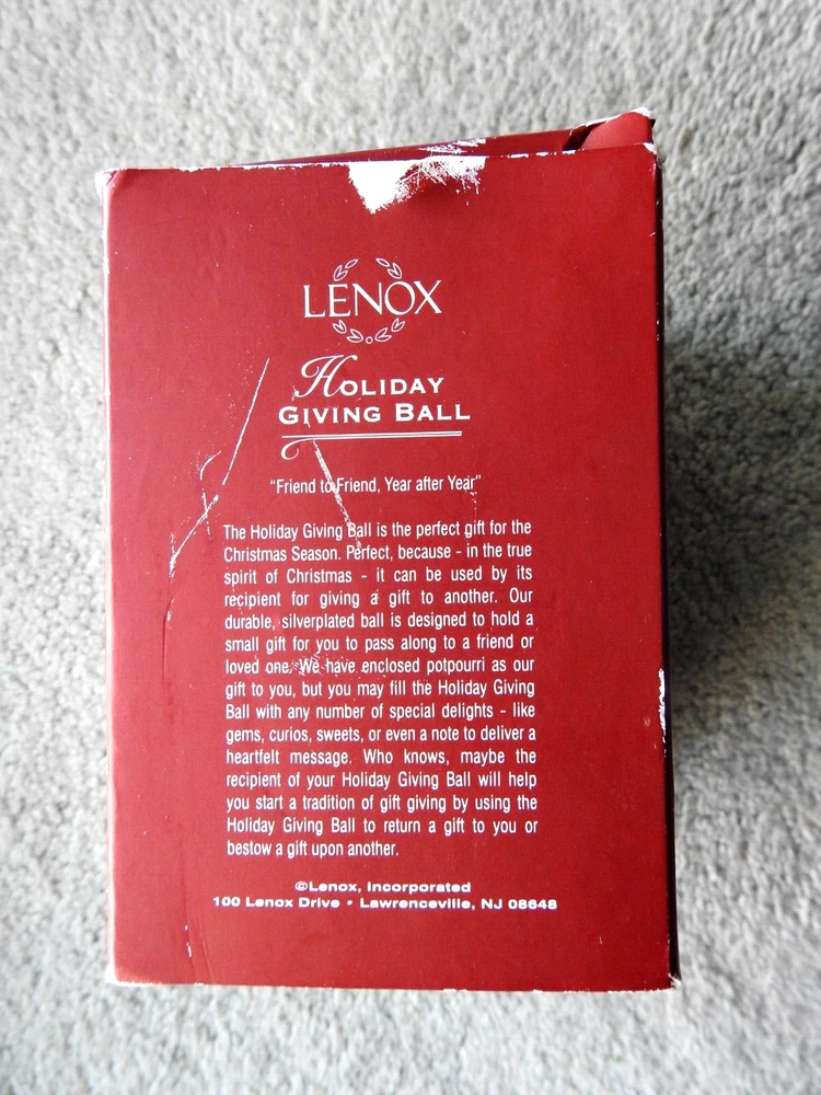 "" Lenox Silver Plated Holiday Giving Ball Friend to Friend Snowflakes "" This Ornament is in Very Nice Condition Box has some handling The items you will receive are the items in the Pictures My pictures are a big part of my description Please see pictures for Ornament & Box details & condition I ship all my items in sturdy boxes for safe arrival with bubble wrap, peanuts, & or tissue paper If you wish to purchase additional items place them 1 at a time in the cart and request an invoice on a computer purchase all together in one payment will save on shipping fees for you. comes from a smoke free home Please Visit My eBay Store for combined shipping Click here to add me to your favorite lists !! I am adding more Hallmarks weekly all quality items at great prices stop by often Please also check my feedback and bid with confidence!! I sell quality items at reasonable prices. Please email me with any questions !!! Comes from a smoke -free home IMPORT DUTIES, TAXES AND CHARGES ARE NOT INCLUDED IN THE ITEM PRICE OR SHIPPING CHARGES. THESE CHARGES ARE THE BUYER'S RESPONSIBILITY. PLEASE CHECK WITH YOUR COUNTRY'S CUSTOMS OFFICE TO DETERMINE WHAT THESE ADDITIONAL COSTS WILL BE PRIOR TO BIDDING/BUYING. You will love the shipping price on this item. Use the shipping calculator with (No hidden fees here). I GLADLY combine auctions for you to help save shipping fees. PLEASE email me that you are still bidding and then wait till all your bidding is over and email me that you are finished. I will send you a combined invoice with one shipping price. Please pay by the 7th day after auction or I reserve the right to relist the item. Thanks for looking and happy bidding!!