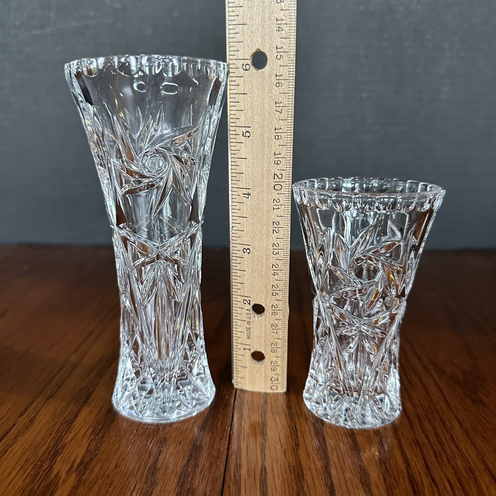 Add a touch of elegance to your home decor with this stunning set of two Lenox Starburst/Pinwheel Czech Crystal Bud Vases. The clear crystal material showcases the exquisite pattern of stars throughout the vase, giving it a traditional and timeless style. The pinched rim adds a unique touch to the vase, making it a perfect addition to any collection of decorative vases. These vases are perfect for displaying your favorite flowers or as a standalone decorative piece. The intricate features of this vase, including the sparkling crystals, make it a must-have for any collector of decorative vases.