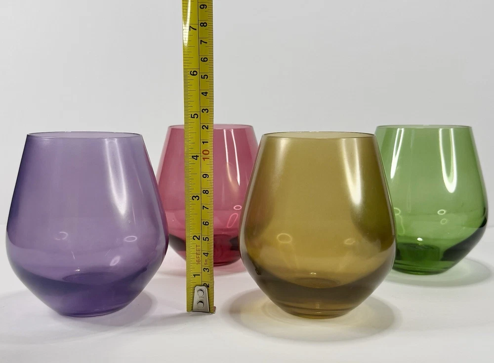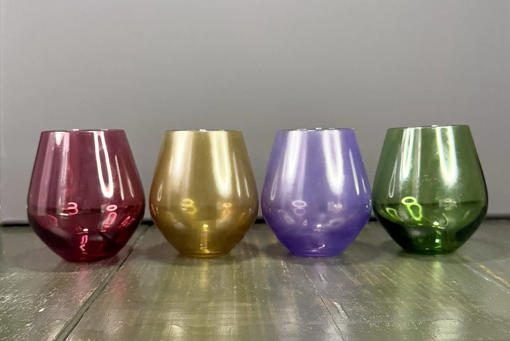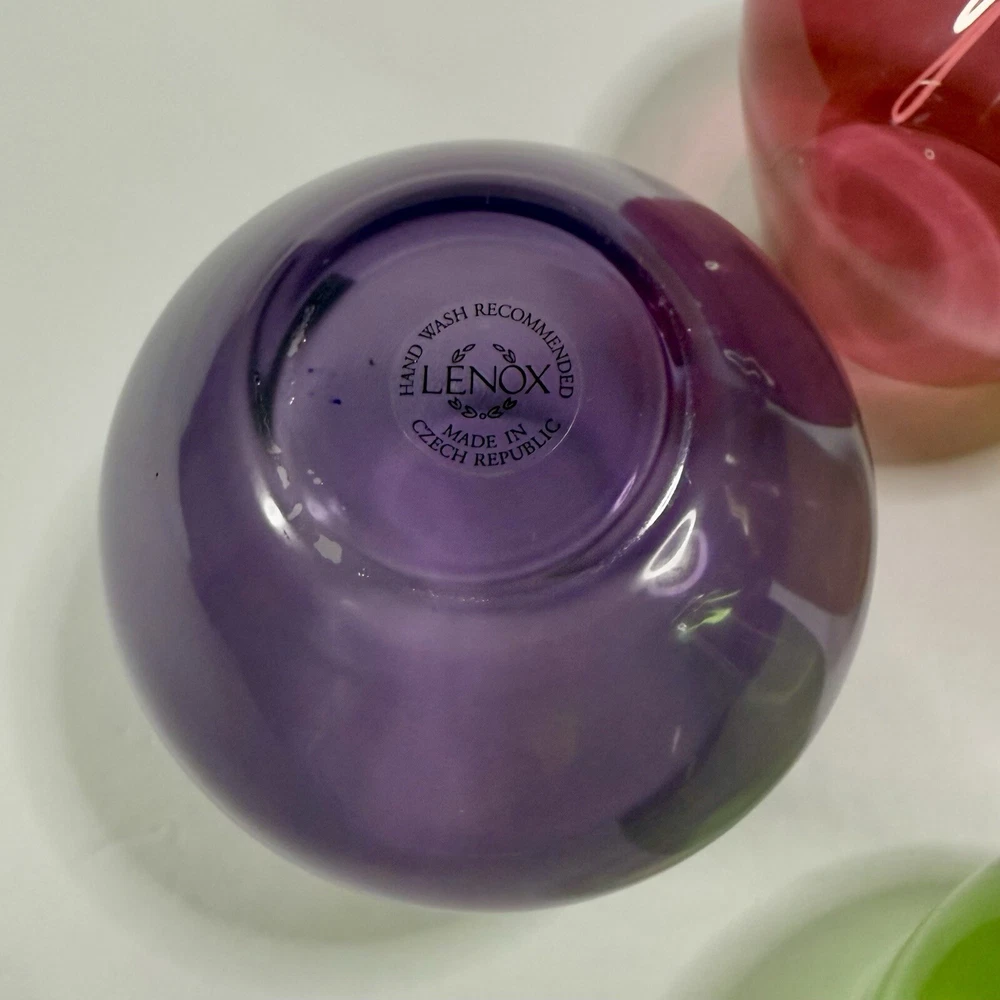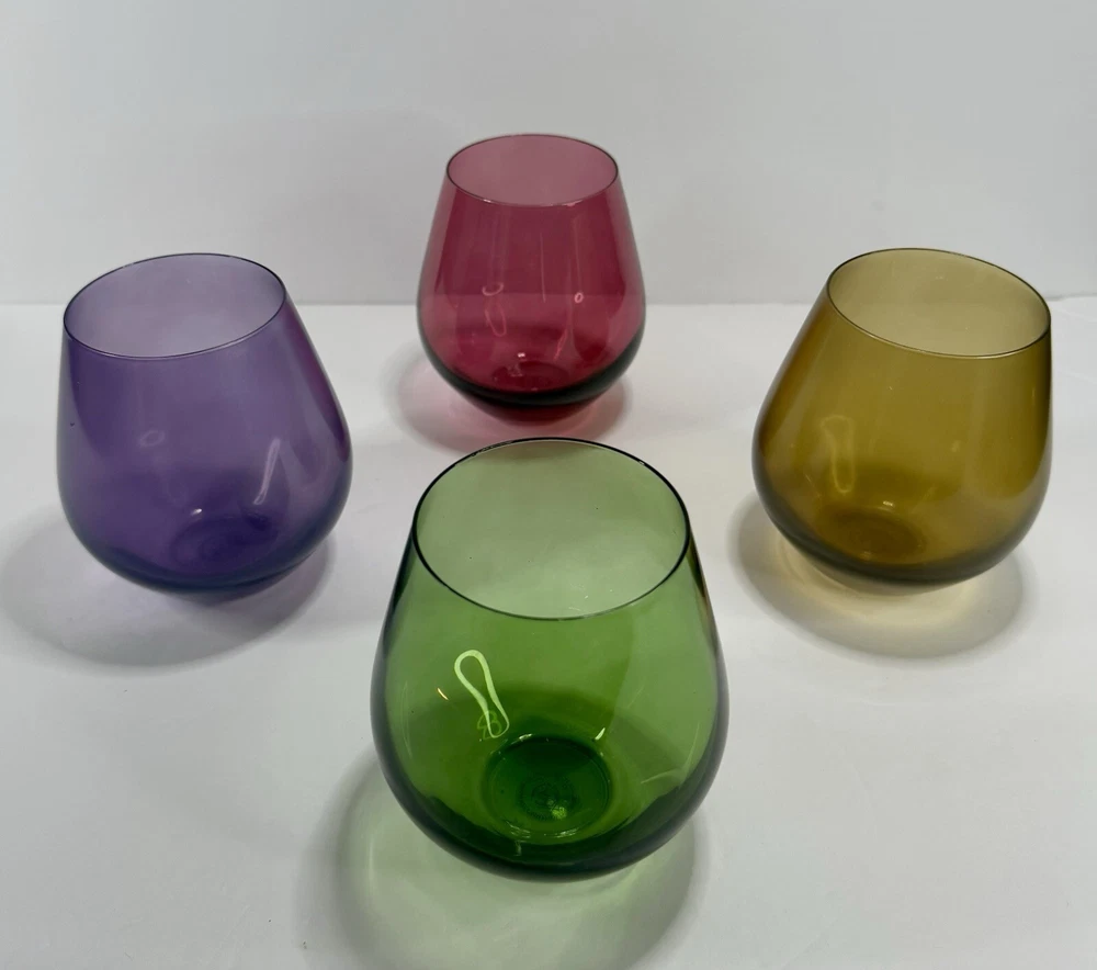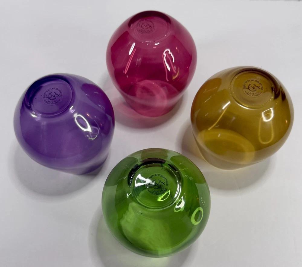 Lenox Tuscany Harvest Stemless Wine Glasses Tumblers Set if 4 in Red, Green,Purple, and Amber. The red and green are transparent glass while the amber and purple are frosted. Pre-owned. Very good condition. No chips or cracks. Slight wear from use. Photos are part of the description.