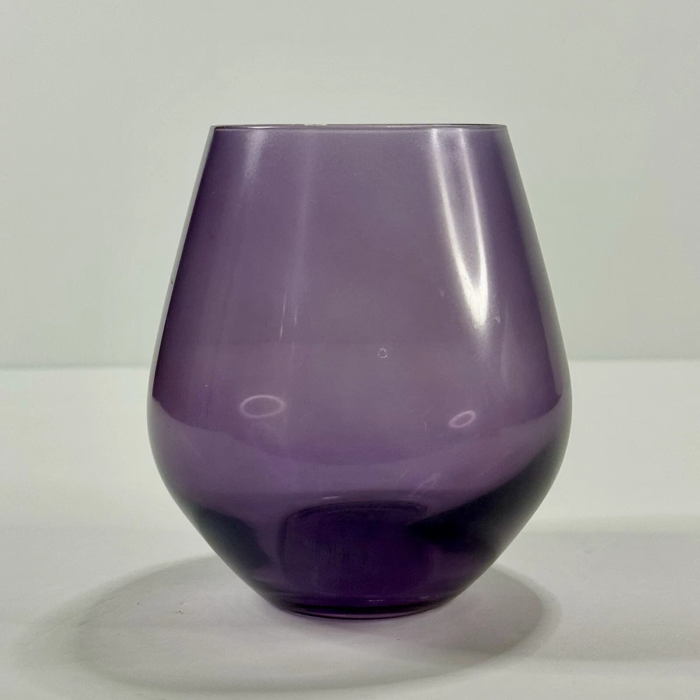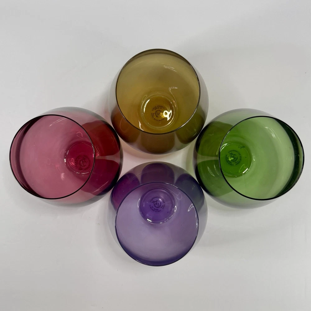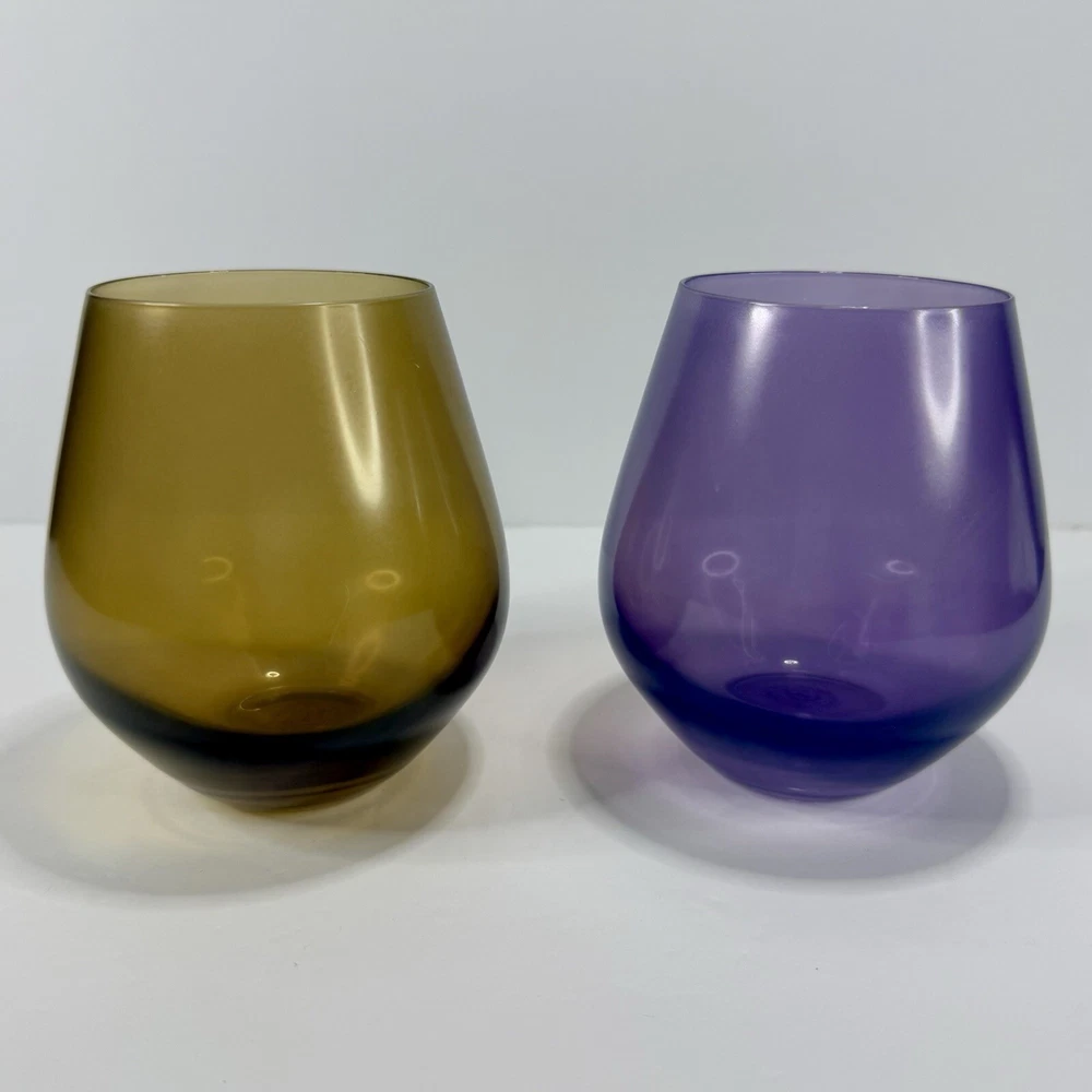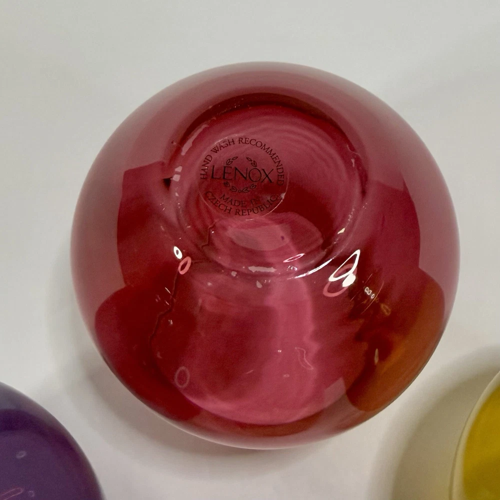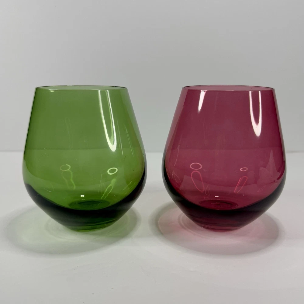 Lenox Tuscany Harvest Stemless Wine Glasses Tumblers Set if 4 in Red, Green,Purple, and Amber. The red and green are transparent glass while the amber and purple are frosted. Pre-owned. Very good condition. No chips or cracks. Slight wear from use. Photos are part of the description.
