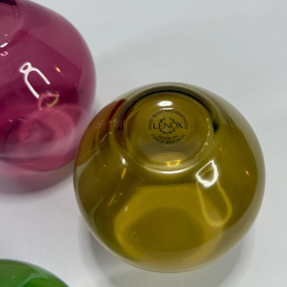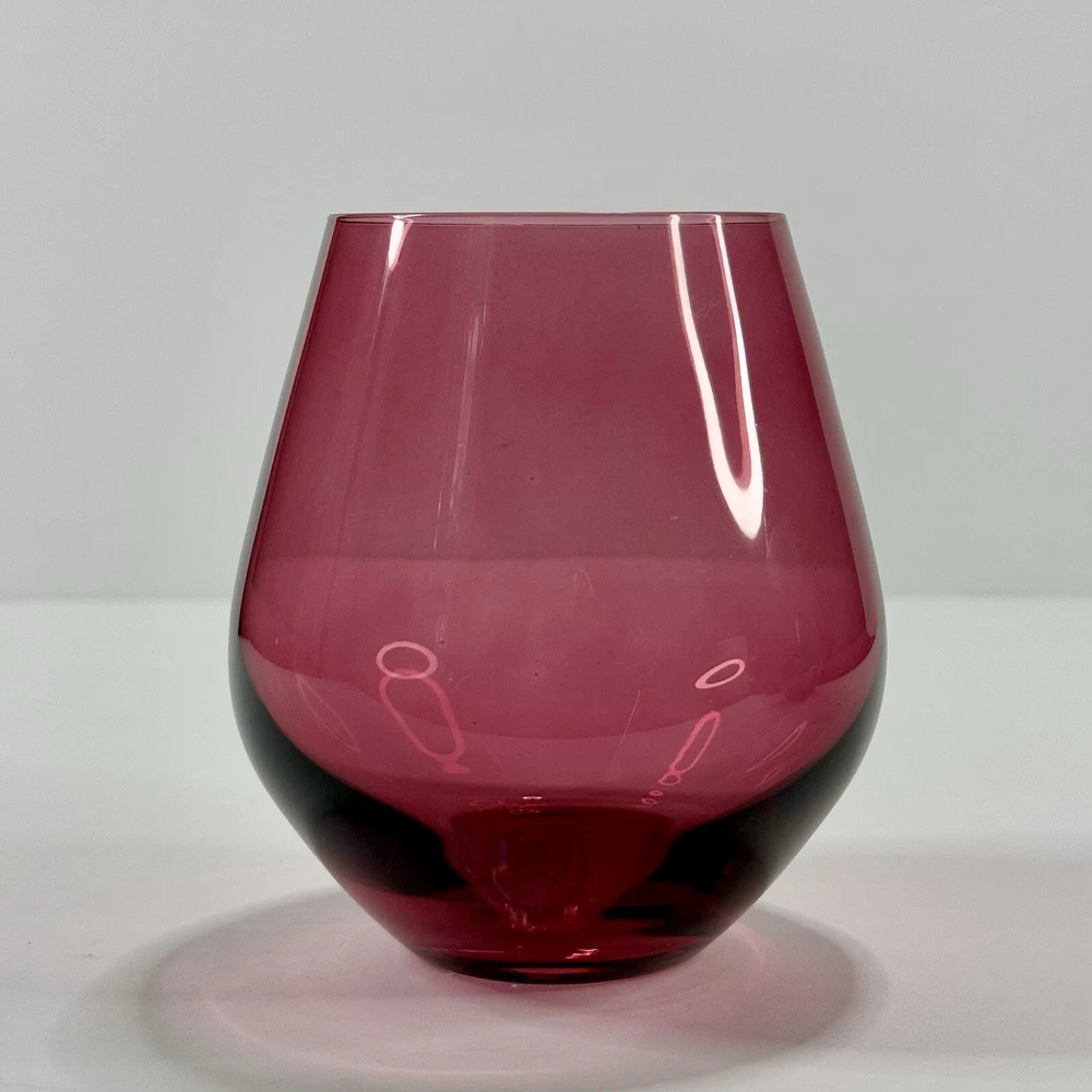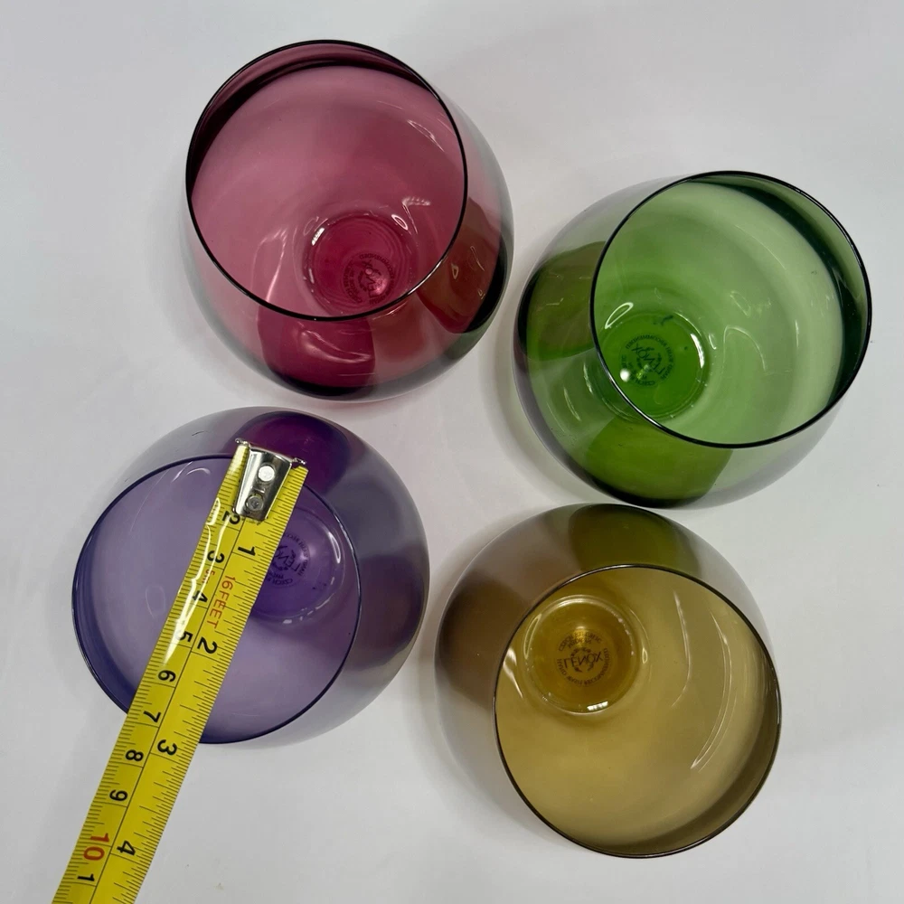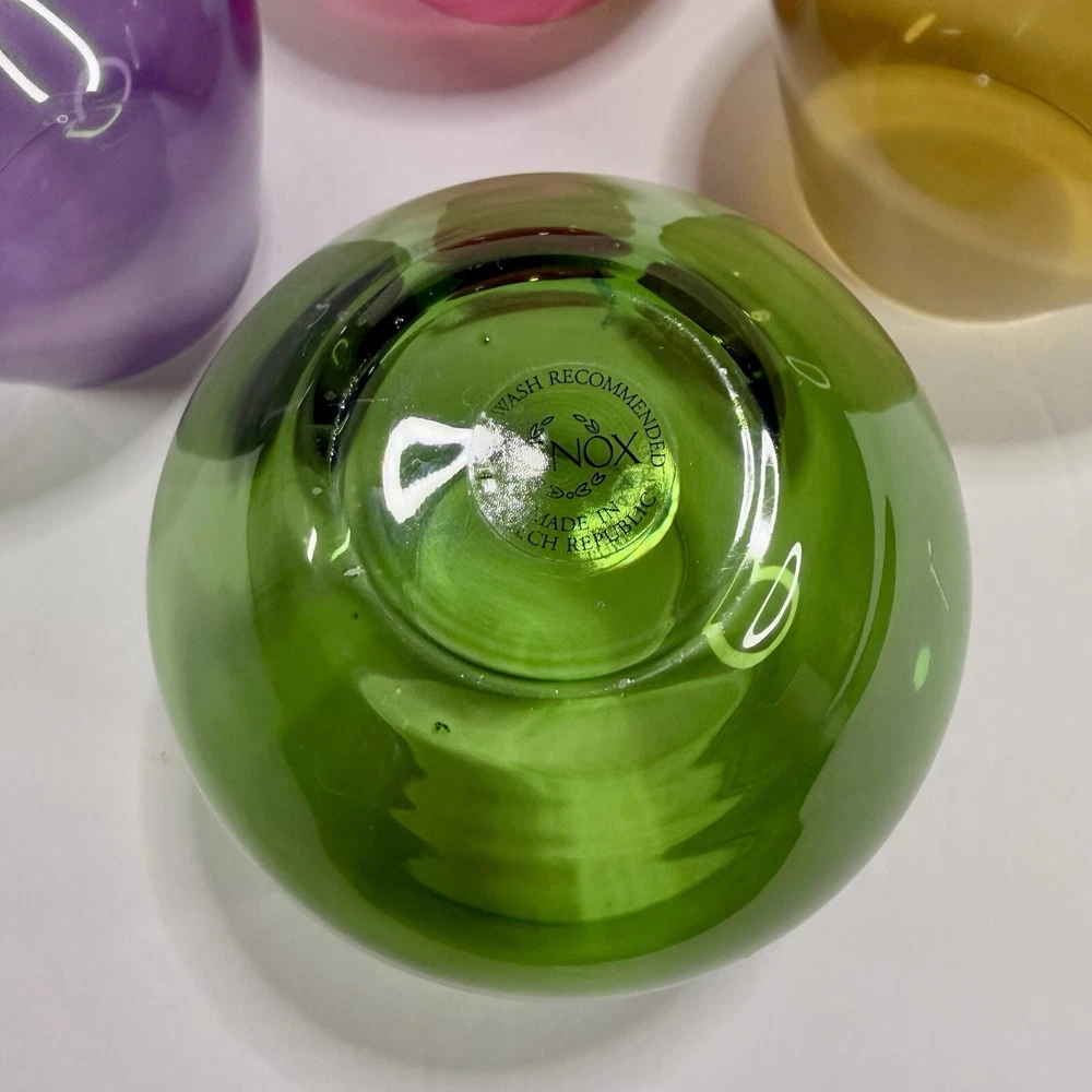 Lenox Tuscany Harvest Stemless Wine Glasses Tumblers Set if 4 in Red, Green,Purple, and Amber. The red and green are transparent glass while the amber and purple are frosted. Pre-owned. Very good condition. No chips or cracks. Slight wear from use. Photos are part of the description.