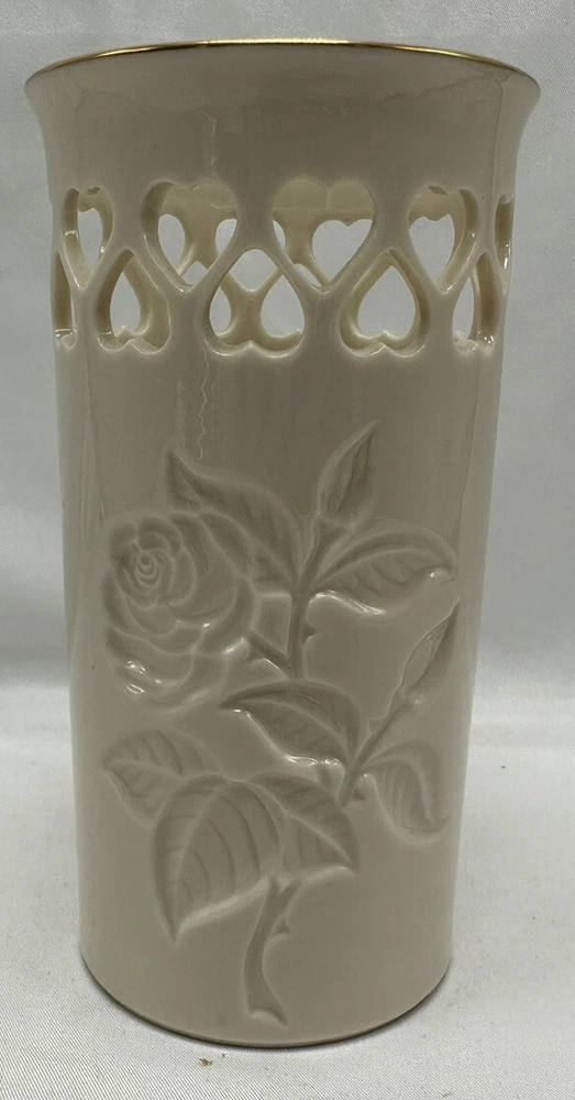 This Lenox USA vase is a beautiful addition to any home decor. The vase is made of high-quality porcelain material and features a glossy finish, making it perfect for indoor use. Measuring at 6 inches in height, this medium-sized vase is adorned with a rose pattern and a pierced hearts design that gives it a delicate and unique appearance. The vase is ideal for all occasions and can be used as a decorative collectible item that is sure to impress. It features a textured, reticulated relief that adds to its luminous look. This original Lenox vase is made in the United States and is perfect for those who love floral-themed decor.