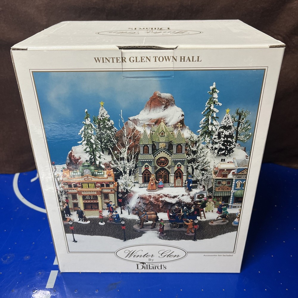 The Lenox Winter Glen by Dillard's Christmas "Winter Glen Town Hall" is a ceramic and porcelain collectible from the Lemax brand. Part of the Winter Glen collection, this Christmas village piece depicts a town hall building featuring lighted Christmas trees. Perfect for adding a festive touch to your holiday decor, this intricately designed piece is sure to bring charm and nostalgia to your seasonal display.