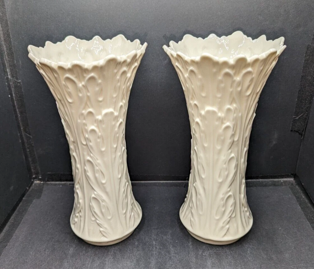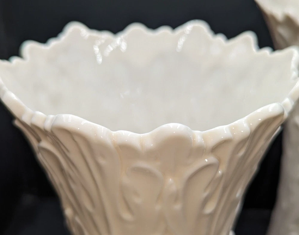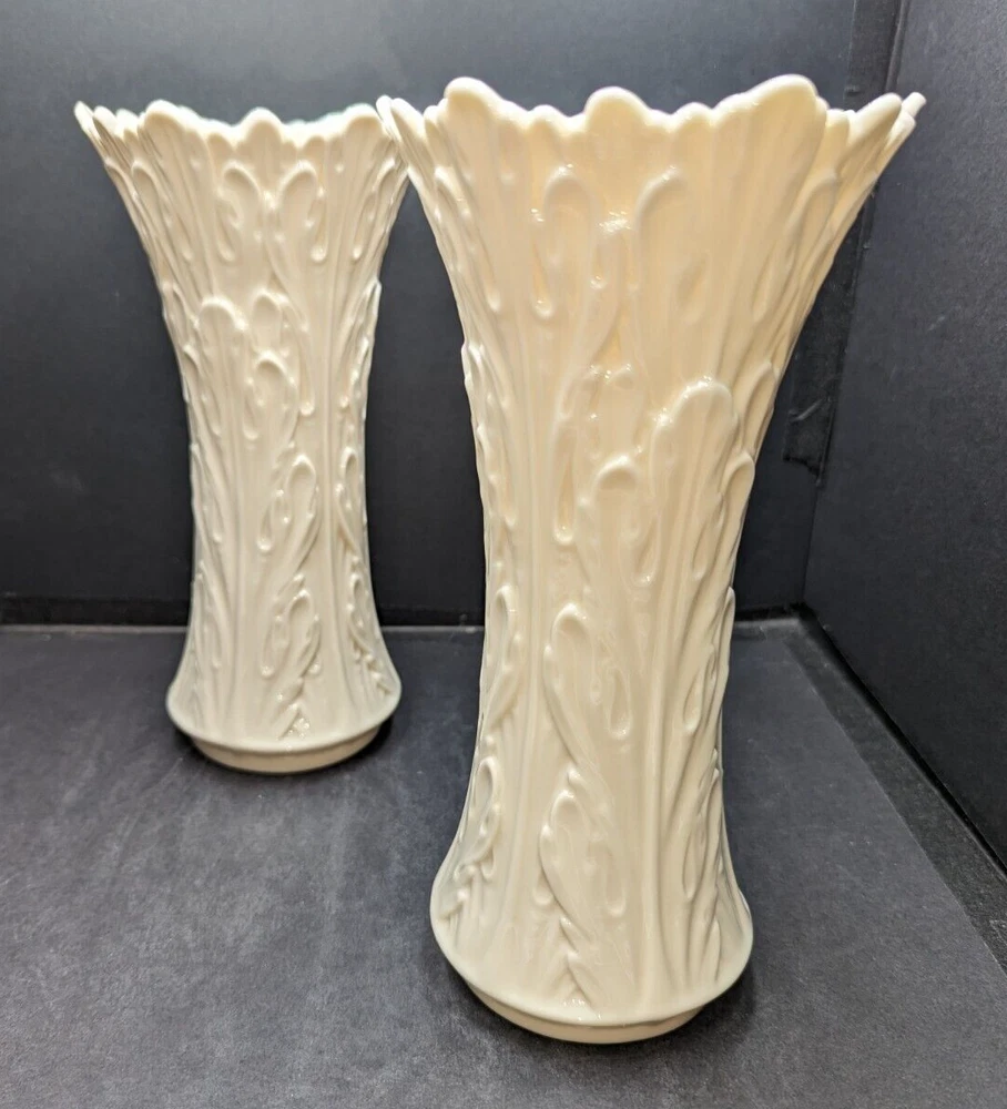 Lenox Woodland Collection Acanthus Leaf Vase 8.25" Off White Set of 2. Very nice pre-owned condition with no damage at all - they're beautiful! All of my items are carefully packed for shipping, no matter their value - $5 items are wrapped with the same care as a $200 item. My goal is to have your purchase arrive safely. I use recycled packaging when possible but mostly use new, high-quality products so your item will arrive intact without damage. Large, heavy and fragile items are harder to use combined shipping with but just ask if you would like to purchase more than one item and I am more than happy to do so if feasible. If not, maybe we can work out a shipping discount. Measurements are approximate or as close as I can get. Also, the color you see many not be the exact color depending on your computer or phone settings. I do my best to make sure that the colors look as accurate as possible on my end. Please note that I offer Priority Mail as well as Ground Advantage on most items. Check the pricing to see which you prefer. Thank you and hopefully you will visit my store again!