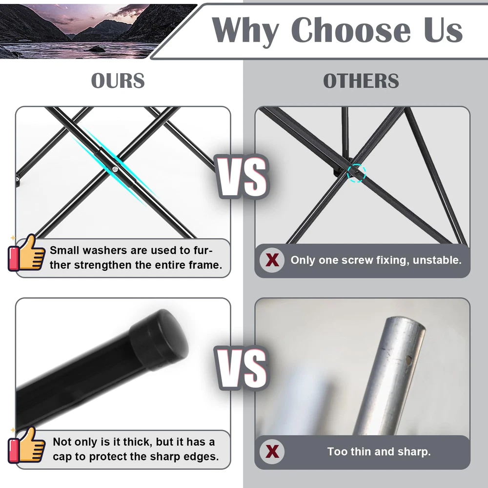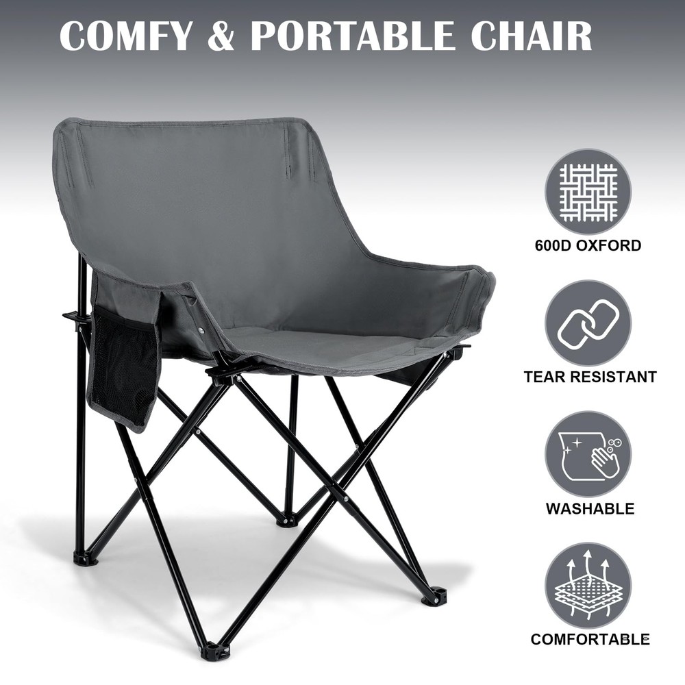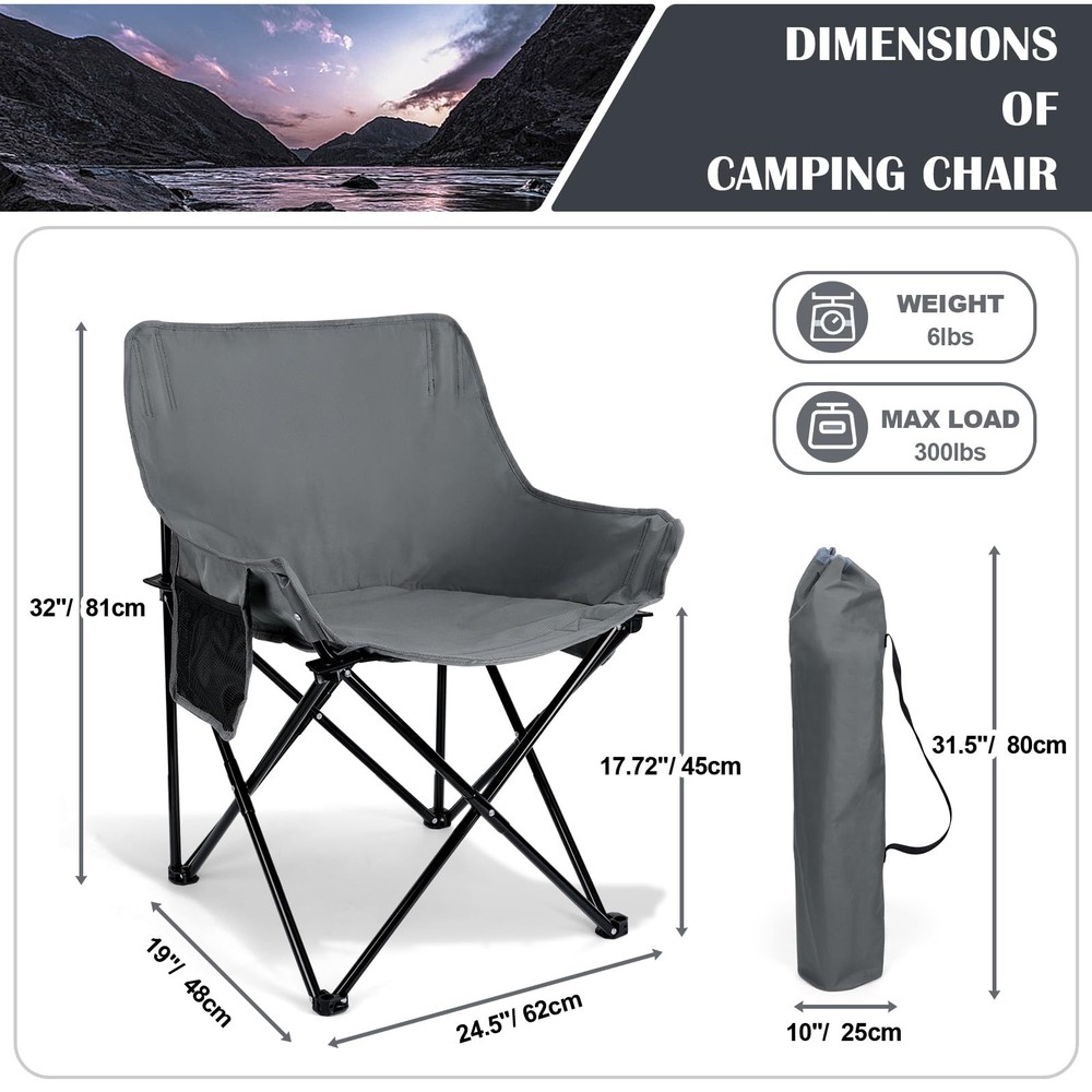 Supreme Comfort Indulgence, camping chair crafted with high-strength double layered 600D oxford fabric with pearl cotton, this moon chairs are designed with strength and comfort in mind for you, its moon-shaped deep ergonomically seat ensures unparalleled comfort and relaxation Convenience and Spaciousness, Unfold our portable camping chair, measuring 24.5" (L) x 19" (W) x 32" (H), and also widen the seat for enough comfort for even the largest of sizes, the convenient Side Pocket keeps your phone and beverage close at hand, experience comfort and convenience in one package Lightweight and Portable, designed for on-the-go convenience, our folding camping chair features an innovative folding design, with a portable carrying bag included, it effortlessly folds down for easy storage and transport, weigh only 6lbs, ensuring a hassle-free journey Safety and Stability, our foldable chair boasts impressive strength with its heavy duty crafted from ultralight aluminum alloy that provides lasting support for 300lbs, it is equipped with a non-slip bottom and a robust support system, ensuring a safe and stable seating experience Share Your Outdoor Time, perfect for parents, couples, families and friends, it's your reliable companion for outside camping, fishing, concerts, picnics, sports, travel and beach activities, experience worry-free relaxation with our trusted camp chairs by your side