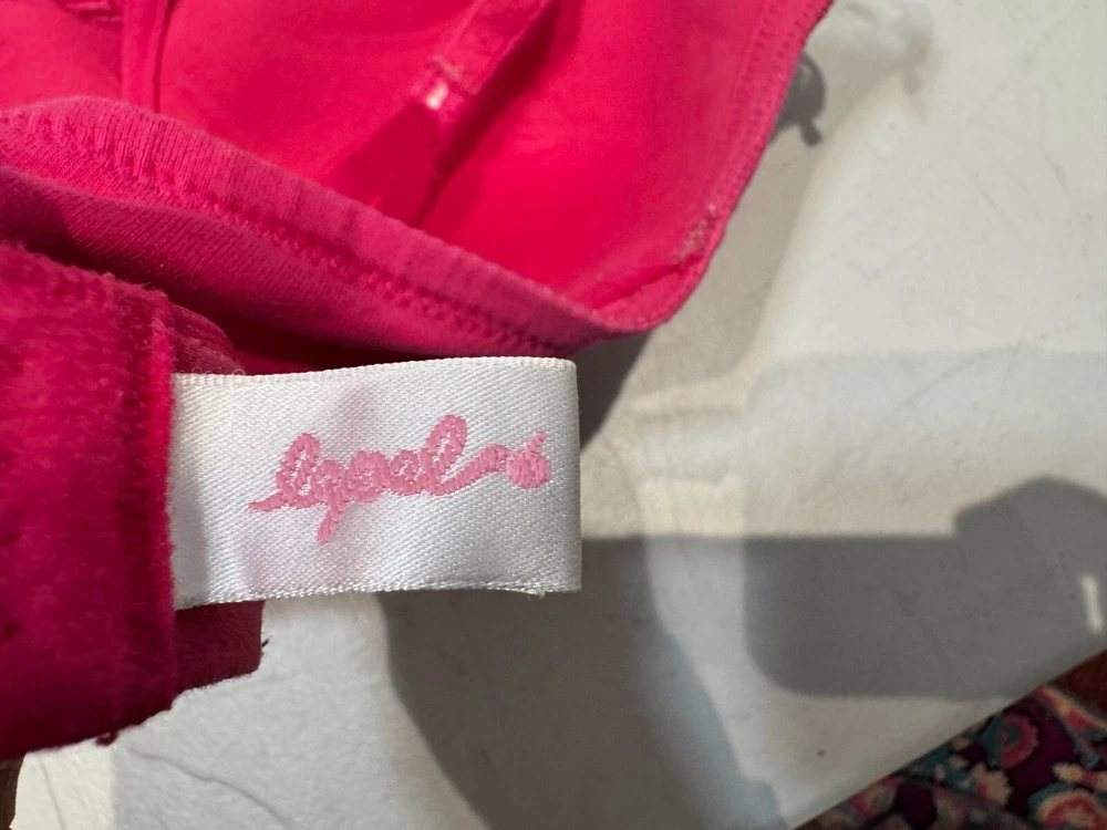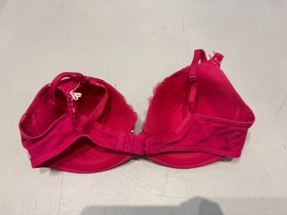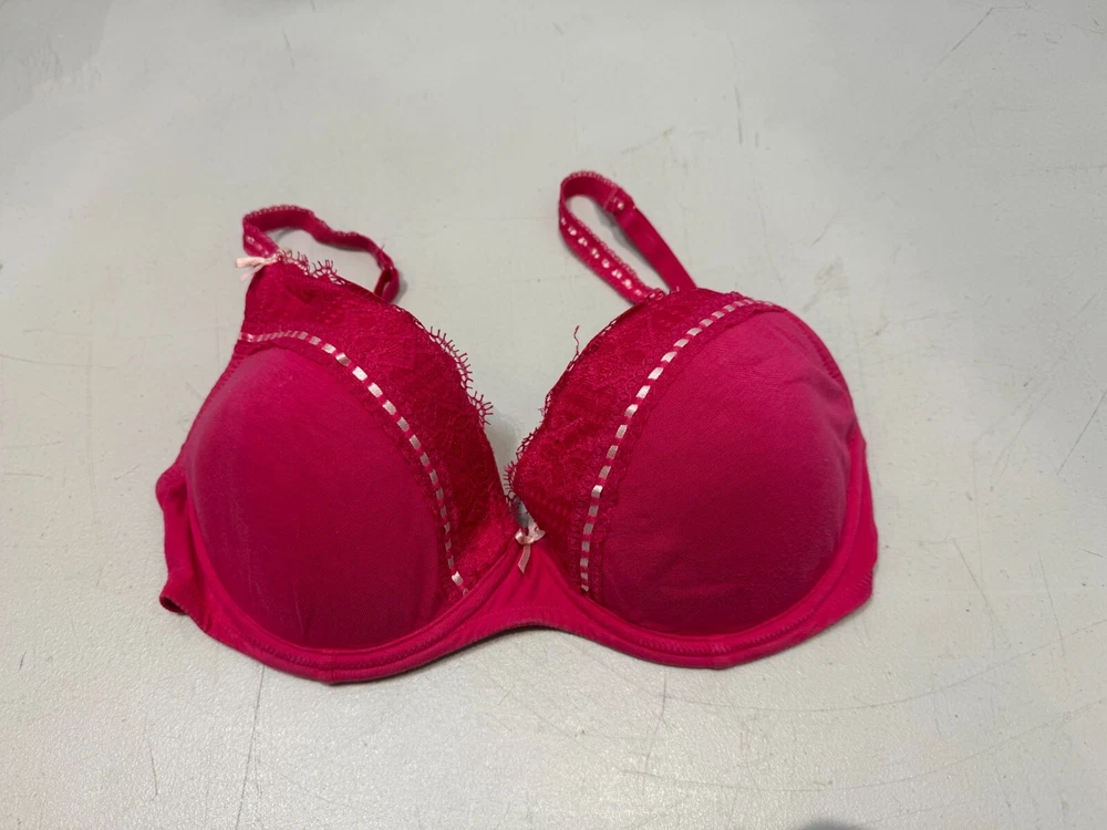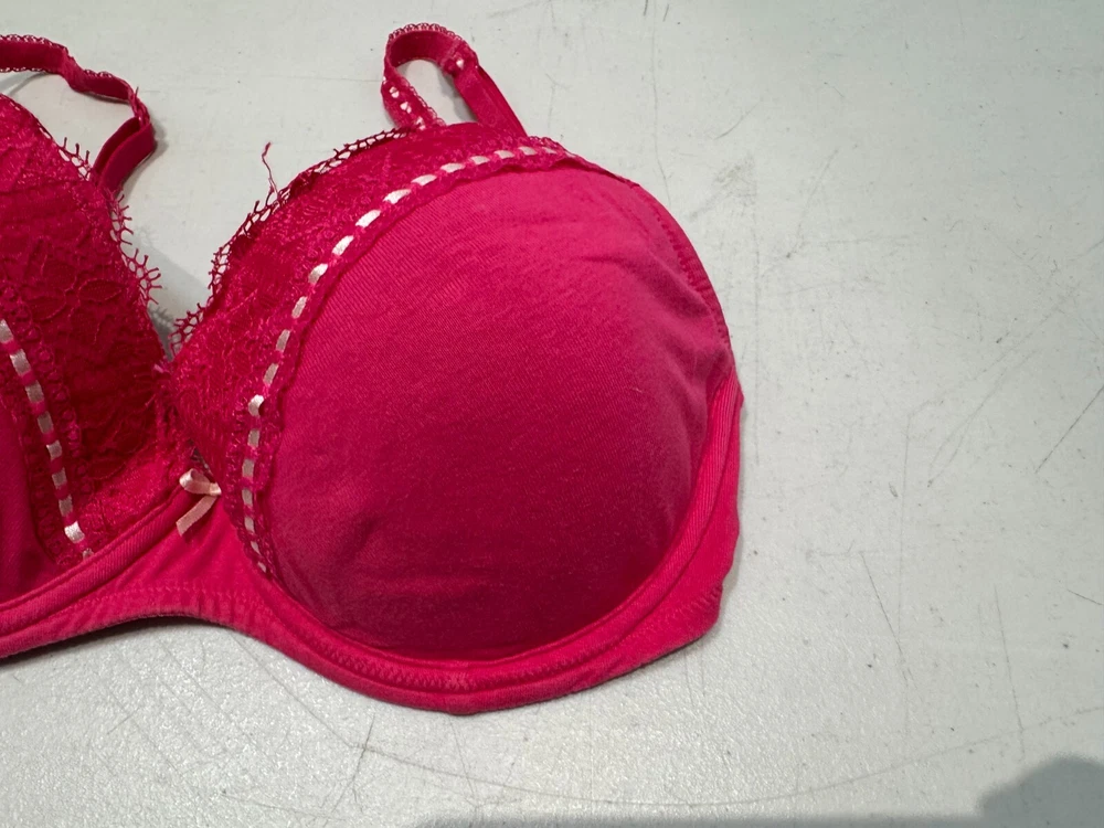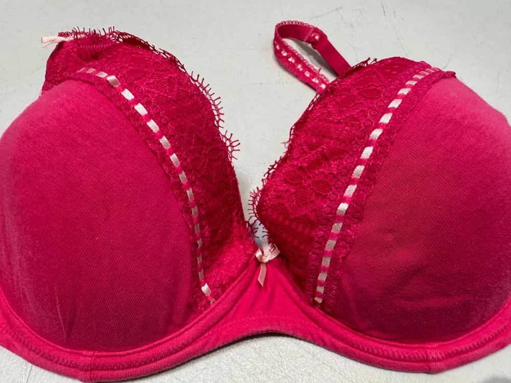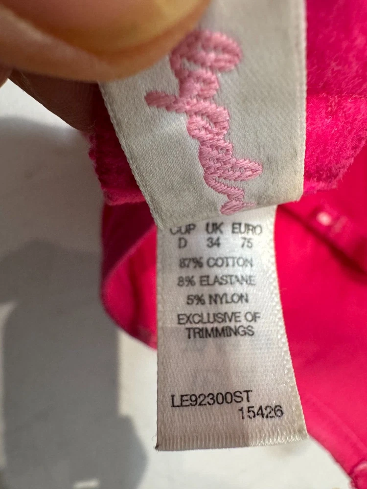 This Lepel balconette bra in size 34D features a floral pattern with lace and embroidered accents in a pretty pink colour. Made from a cotton blend material, this underwired bra has bra straps and a hook & eye closure for a secure fit. The bra is designed with padded cups for added comfort and support, making it a stylish and practical choice for everyday wear.