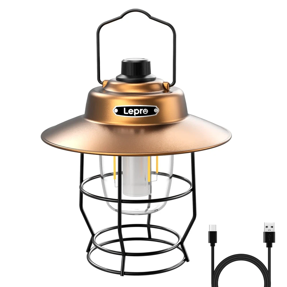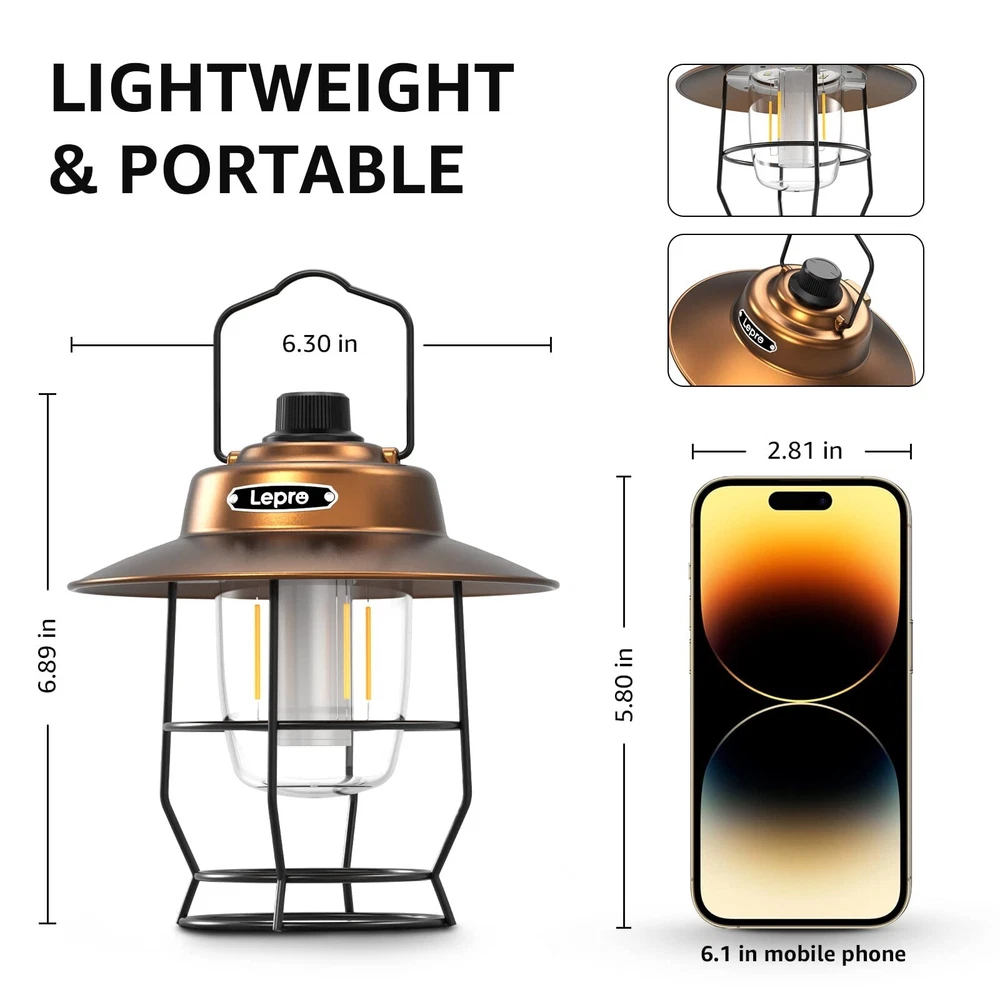 Lepro Vintage LED Camping Lantern Rechargeable, Power Bank, Christmas Decorations, Retro Style, Classic Railroad Lantern with Dimmable Control, Portable Hanging Tent Light for Camping, Power Outages Product Details Light Source Type: Light Emitting Diode (LED) Brand: Lepro Color: Bronze Power Source: USB Rechargeable Material: Acrylonitrile Butadiene Styrene (ABS) Product Dimensions ‏ : ‎ 6.3 x 6.3 x 6.89 inches; 10.58 ounces Item model number ‏ : ‎ PR330039 Batteries ‏ : ‎ 1 Lithium Ion batteries required. (included) Date First Available ‏ : ‎ October 26, 2022 Manufacturer ‏ : ‎ Lepro Country of Origin ‏ : ‎ China Customer Reviews: 4.6 4.6 out of 5 stars 148 ratings Product Dimensions: ‎6.3"L x 6.3"W x 6.89"H Battery Description: ‎Lithium-Ion Brightness: ‎450 Lumen Item Weight: ‎0.3 Kilograms Mounting Type: ‎Tabletop Mount Water Resistance Level: ‎Waterproof Battery Life: ‎26.75 Hours Bulb Base: ‎GU10 Number of Batteries: ‎1 Lithium Ion batteries required. (included) Specification Met: ‎IPX3 Voltage: ‎5 Wattage: ‎6 watts Manufacturer: ‎Lepro Part Number: ‎PR330039 Item Weight: ‎10.6 ounces Country of Origin: ‎China Item model number: ‎PR330039 Batteries: ‎1 Lithium Ion batteries required. (included) Item Package Quantity: ‎1 Included Components: ‎Batteries included Batteries Included?: ‎Yes Batteries Required?: ‎Yes Date First Available: October 26, 2022 Dimmable & Pleasant Bright. Rechargeable lantern comes with a dimming function and has 3 lighting modes (white light, warm light and warm white light). Just turn the top switch then smoothly dials from low light to high. The output ranging from 15LM to 450LM allows you to completely brighten your surroundings or simply set the mood. Long Battery Life & Emergency Charging. This LED camping lantern built-in rechargeable battery, which can be used for 50 hours on low or 3.5 hours on high after 4 hours of charging via a USB-C cable (included). And there are four LEDs that conveniently let you know how much charge left and charge in time. Lantern can also serve as a power bank for cell phones or mobile devices in emergency. Retro & Portable Design. 5.5*5.5*7.4 in, weighs only 0.88 pounds, lightweight and portable, you can easily carry the LED lantern to anywhere, not only on the tabletop, but also hanging on shepherd hooks, tents or branches. Vintage shape and texture resembling a traditional barn lantern, it is a nice companion for camping and outdoor dining or a peaceful evening stroll. Sturdy & Water Resistant. The outdoor Lantern is made from metal construction and seeded glass globe, high-quality iron protects the interior lighting cover, durable in nature and still function flawlessly from the backyard to the backcountry. Wide Application. This LED lantern is the perfect addition to any situation - can be used in garden, camping tent, emergency lighting, home power outage, Christmas party decoration, and enhances ambience by offering a soft, warm, unobtrusive glow. It is an ideal holiday gift for your family or friends.