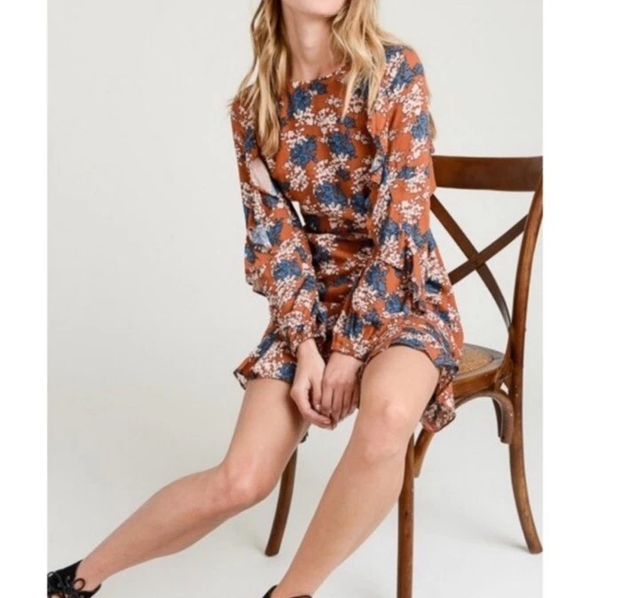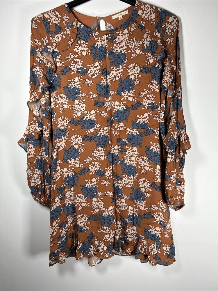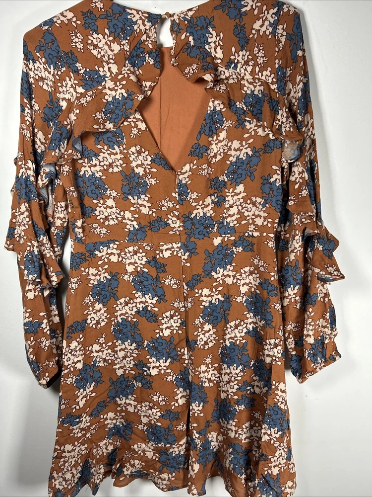 Les Lis Brown floral Long Sleeve Open Back Fall Dress Large. Condition is Pre-owned. Shipped with USPS Ground Advantage.