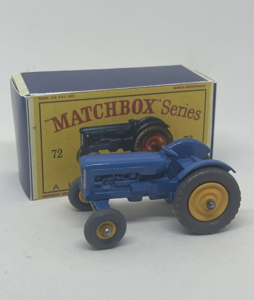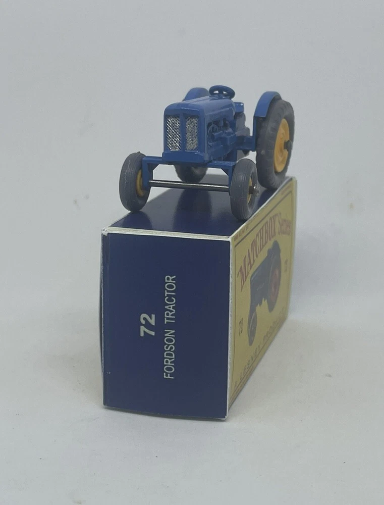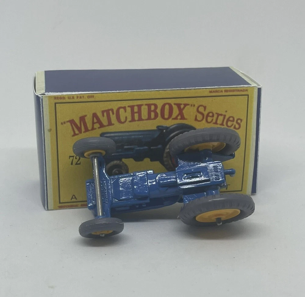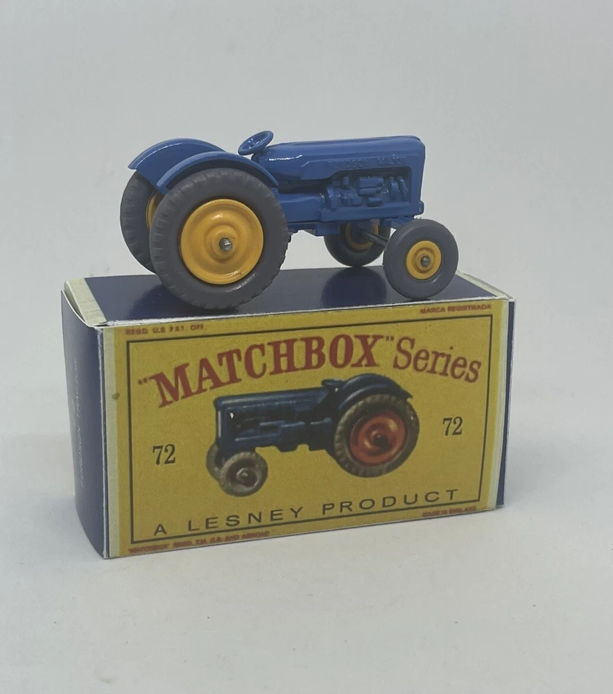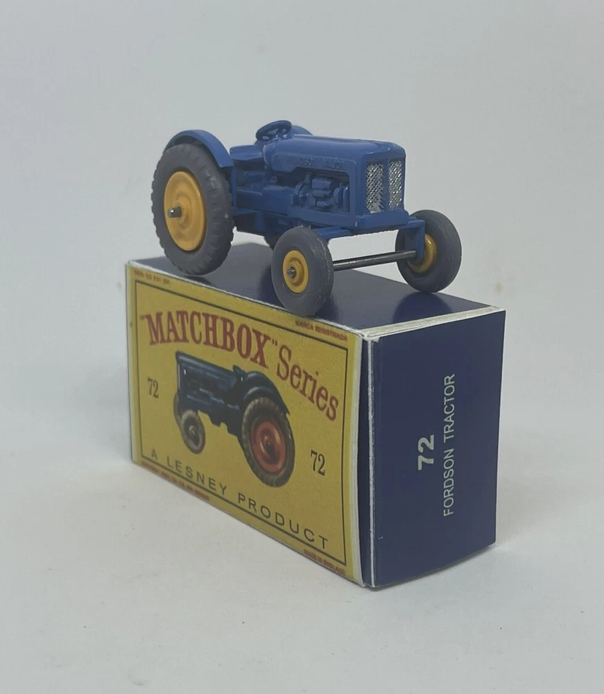Vintage Lesney Matchbox 72 Custom Ford Tractor with yellow wheels nice RESTORED, NOT ORIGINAL. I restored the vehicle to a high standard with a new displayable storage box. These models and packaging are not original. Please look at the pictures carefully as they are part of the description. Please ask questions before bidding. I combine shipping with multiple orders. These are custom models so I do not except returns. This is a hobby and the vehicle was a used played with toy now restored.