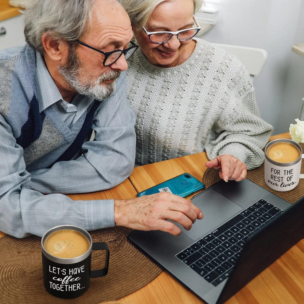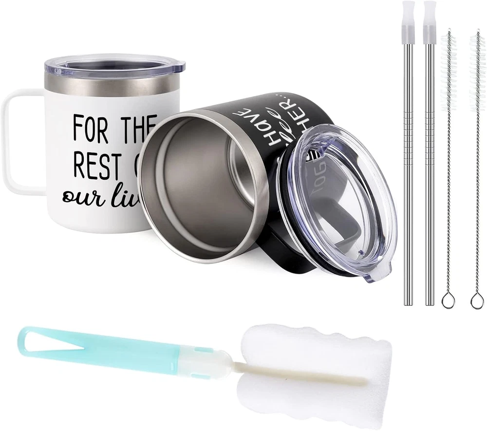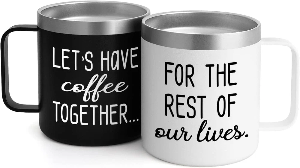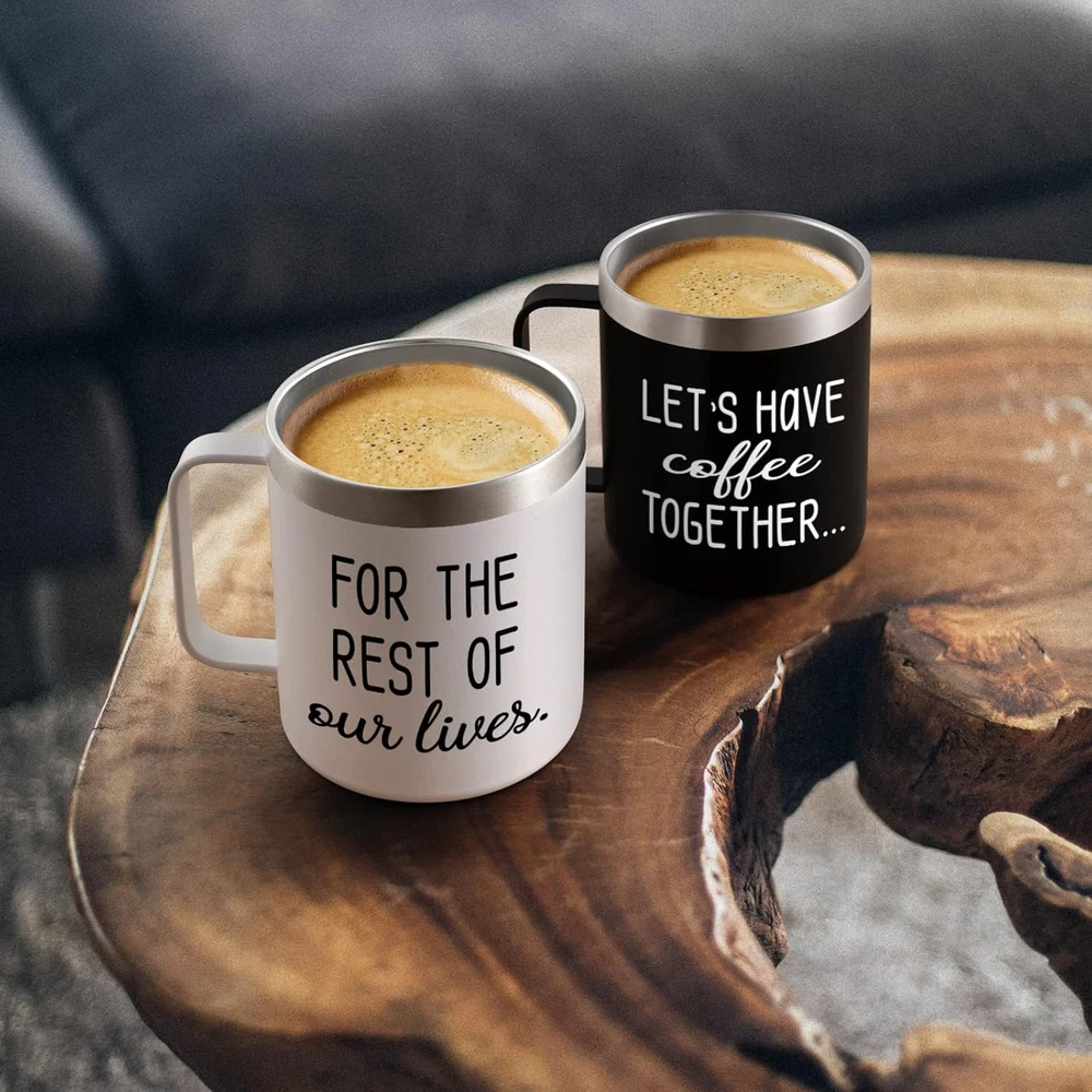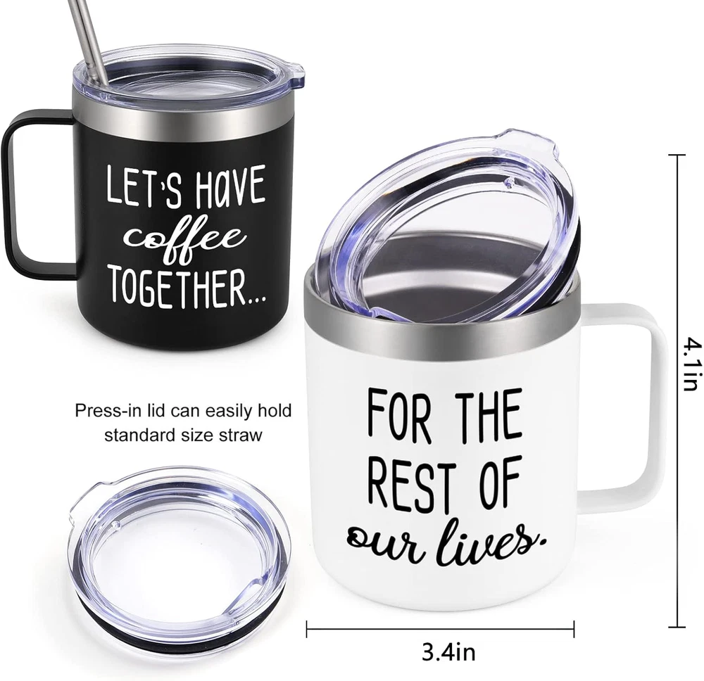 ROMANTIC COUPLE GIFT SET: This Let’s Have Coffee Together coffee Mug set can be used as an awesome gifts for couple on Wedding, Valentine’s Day, Engagement, Anniversary. Meanwhile, you can give the romantic engagement gift mug set to your wife, husband, girlfriend, fiance, newlywed and another you loved one on Birthday, Christmas and other big day. COUPLE GIFT FOR MANY OCCASIONS: The insulated mug set for couples are not only a perfect gift idea for Anniversary, Valentines day, Wedding, Birthday, Christmas, also great to give as Gag gift, Engagement gifts, White Elephant gifts exchange, or presents for special celebrations. GOOD INSULATION: Our engagement gifts mug set for couple are designed with double-wall vacuum insulation that can keep cold drinks for 9 hours and hot drinks for 5 hours, which ensures that your drinks at the ideal temperature at any time and protect your hands from the temperature of the beverage in the cup. SWEAT-PROOF AND LEAK-PROOF: Premium quality material makes this couple mug set sweat-proof. No matter how long you hold it, there is no sweat at all and it is always dry and comfortable to touch. The lid comes with a removable rubber gasket for maximum spill prevention. The top has a straw hole for easy sipping, and the straw also has a rubber nozzle to prevent burning of the mouth. SAFE AND EASY TO CLEAN: The wedding gifts coffee mug set is made from high quality 18/8 304 food grade stainless steel. Lead free and sturdy, it is reusable and will not rust or leave a bad metallic taste in your mouth. It is recommended to clean the cups with the cup brush we provide, which does not affect the pattern and is easy to clean. Product Description "Lets Have Coffee Together for The Rest of Our Lives" If you’re looking for unique gifts set for couples, this "Lets Have Coffee Together for The Rest of Our Lives" coffee mug will be a gorgeous gift for them! Give them the gift they will reuse and love. Choose our couple gift mug set, witness your true love! This 12oz romantic engagement gift mug set is a special and sweet wedding gift choice for your wife, husband, fiance, girlfriend on Wedding, Engagement, Valentine’s Day, Anniversary, Birthday and other special occasions. Romantic Couple Gift Set This Let's Have Coffee Together coffee mug set can be used as an awesome gift for couple on Engagement, Wedding, Valentine’s Day, Engagement, Anniversary. Double Wall Vacuum Insulation Our gengagement gifts mug set are designed with double-wall vacuum insulation that can keep cold drinks for 9 hours and hot drinks for 3 hours, which ensures that your drinks at the ideal temperature at any time. Premium Material Our couple gifts mug set is made of BPA Free food-grade 304 stainless steel, In addition, the strong stainless steel material is durable and sweat proof.