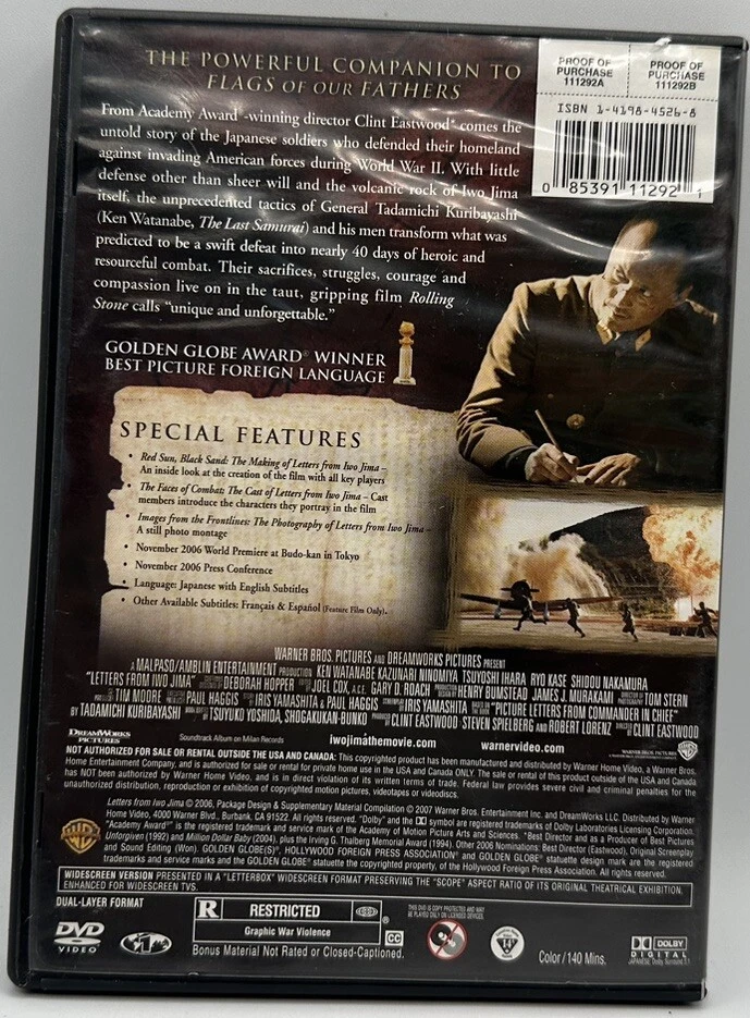 This DVD features the 2006 war drama film "Letters from Iwo Jima" directed by Clint Eastwood. The movie is presented in widescreen format and comes in a 2-disc set, including a special edition. It has a run time of 140 minutes and is rated R. The DVD is compatible with Region Code 1 (US, Canada...) and features English, Japanese, French, and Spanish subtitles. The movie stars Ken Watanabe and is sub-genre Japanese family drama. The DVD is in the Tall/DVD case type and was released in 2007 by Warner Bros. This cult cinematic movement movie is a must-watch for movie enthusiasts.