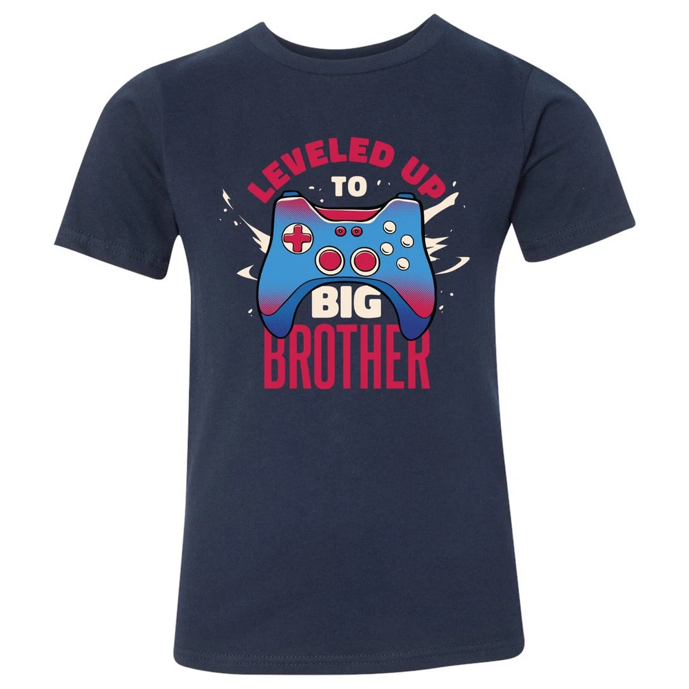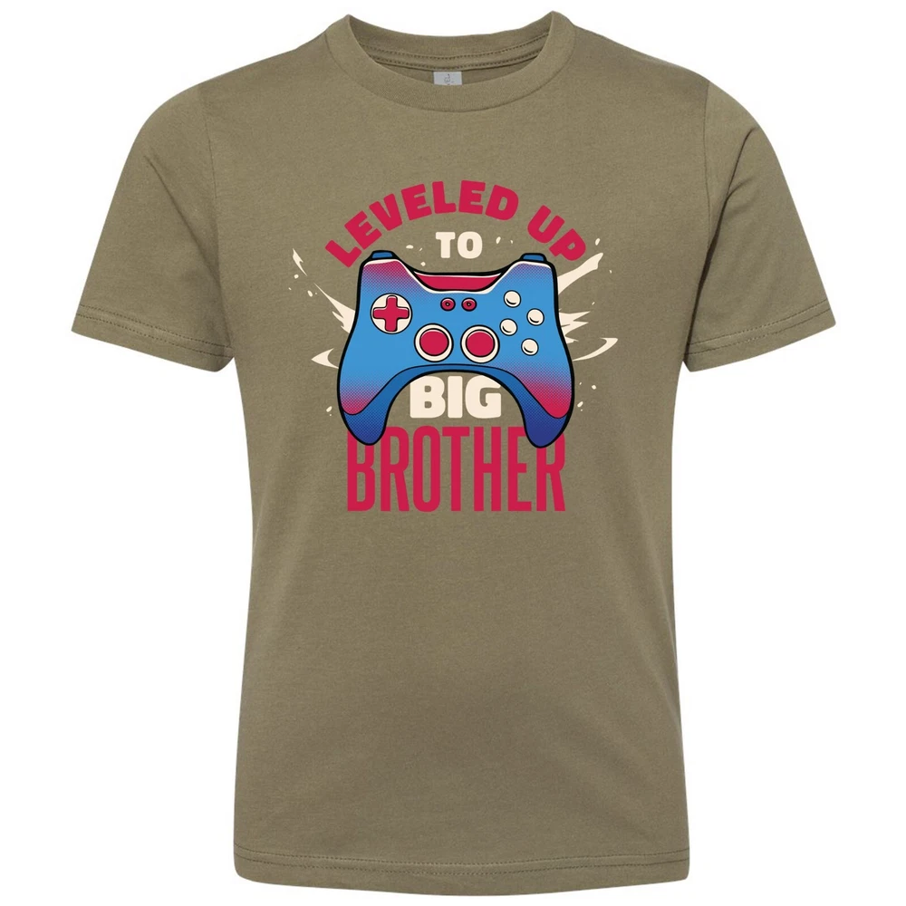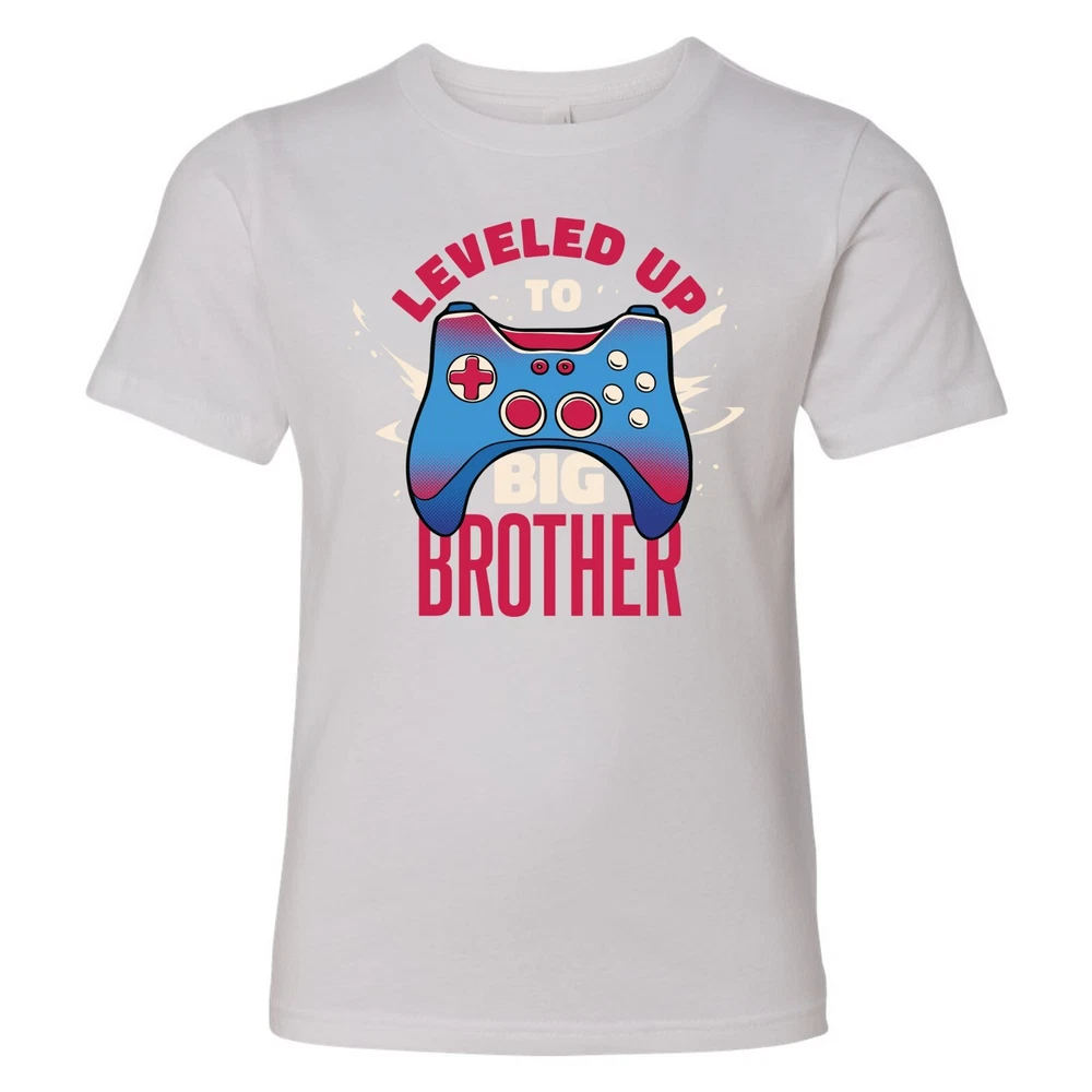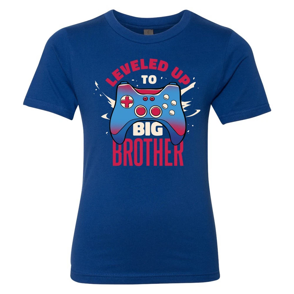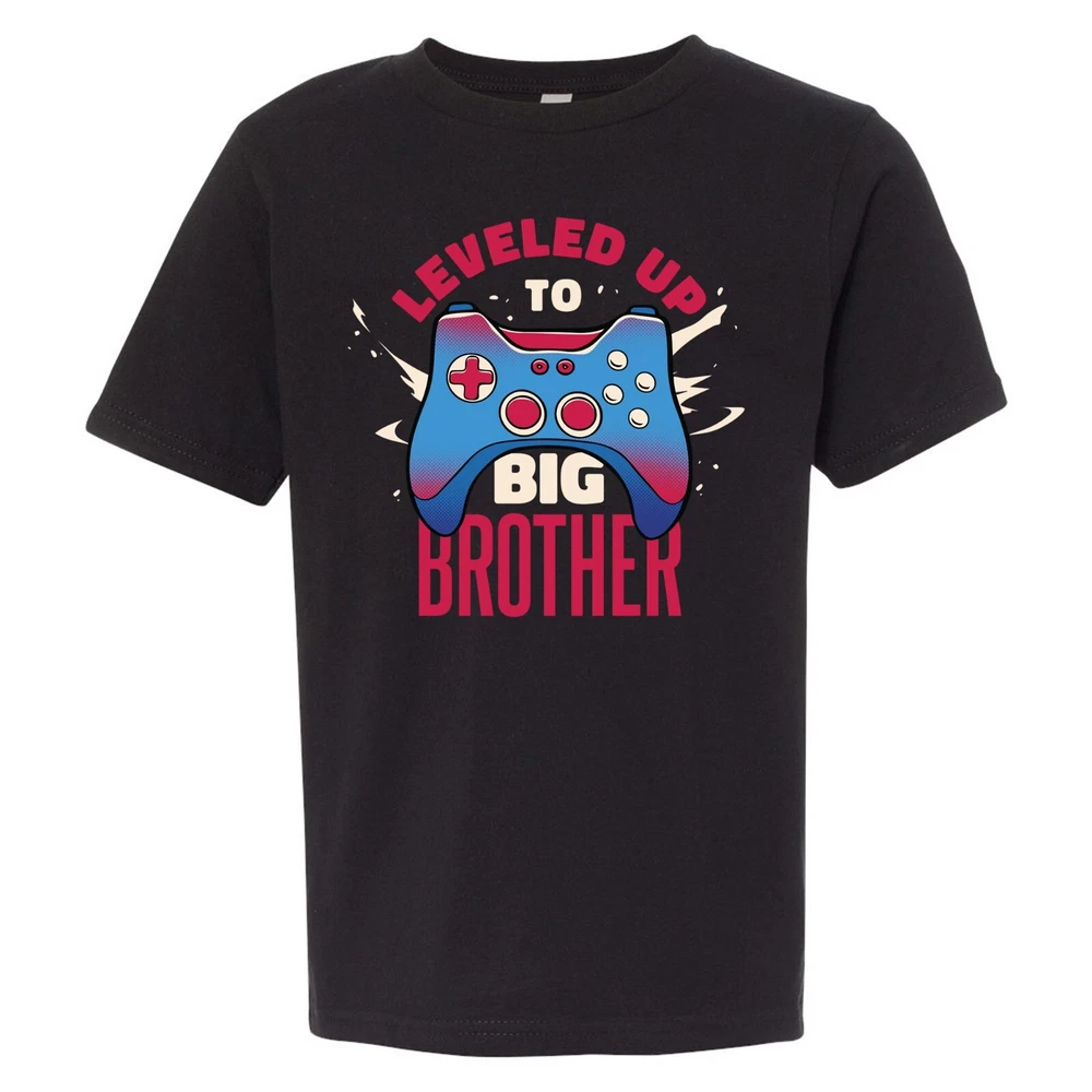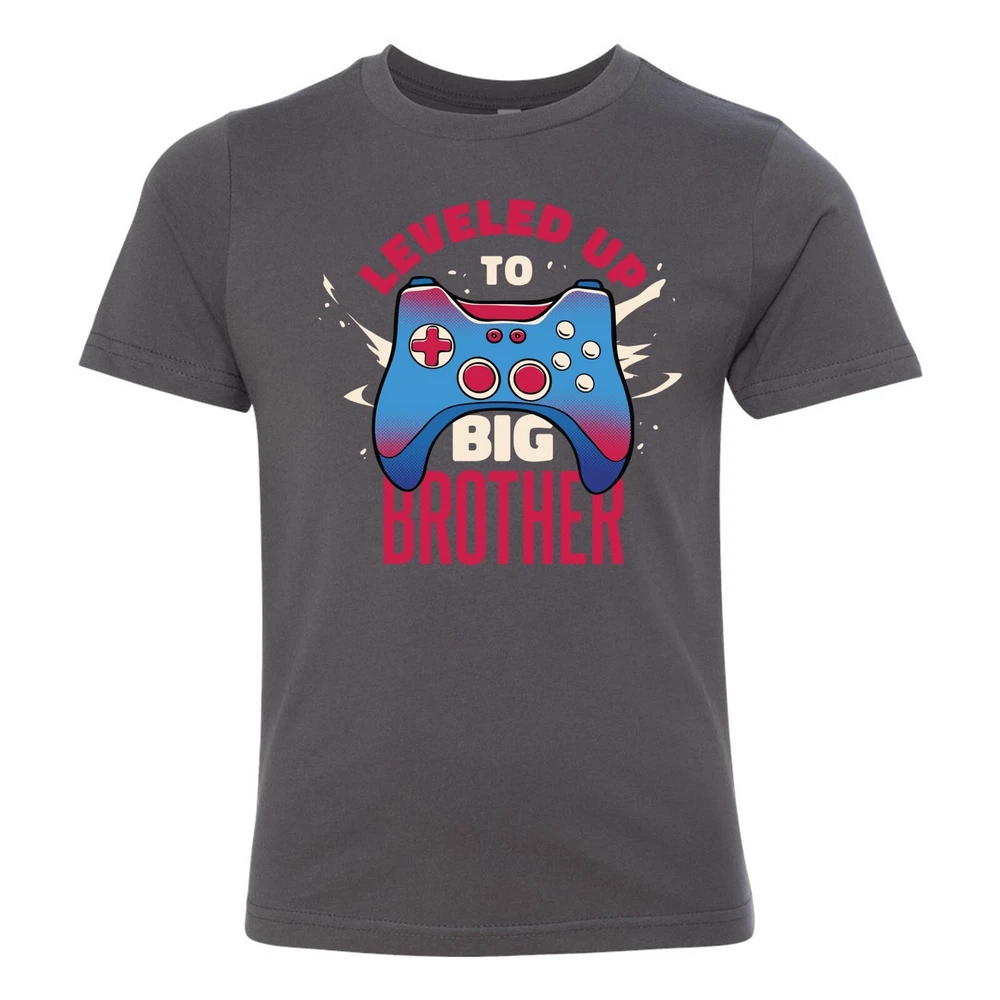 Leveled Up to Big Brother Graphic Art Kids Youth Unisex Cotton Tee Product Details Super soft and comfortable lightweight fabric 100% Combed ringspun cotton Unisex - Modern fit High quality print and finish Vivid and crisp full-color graphic print made to last Graphics printed in USA Fabric laundered 1x1 baby rib set-in collar with front coverstitching Hemmed sleeves Side seams Fast shipping About Us We offer a wide variety of original and novelty graphic artwork tees from simplistic to eye-catching rich-in-color image designs. Our graphic shirts are proudly printed in the USA using the latest printer technology that boasts a sharp, vibrant and long-lasting print output.